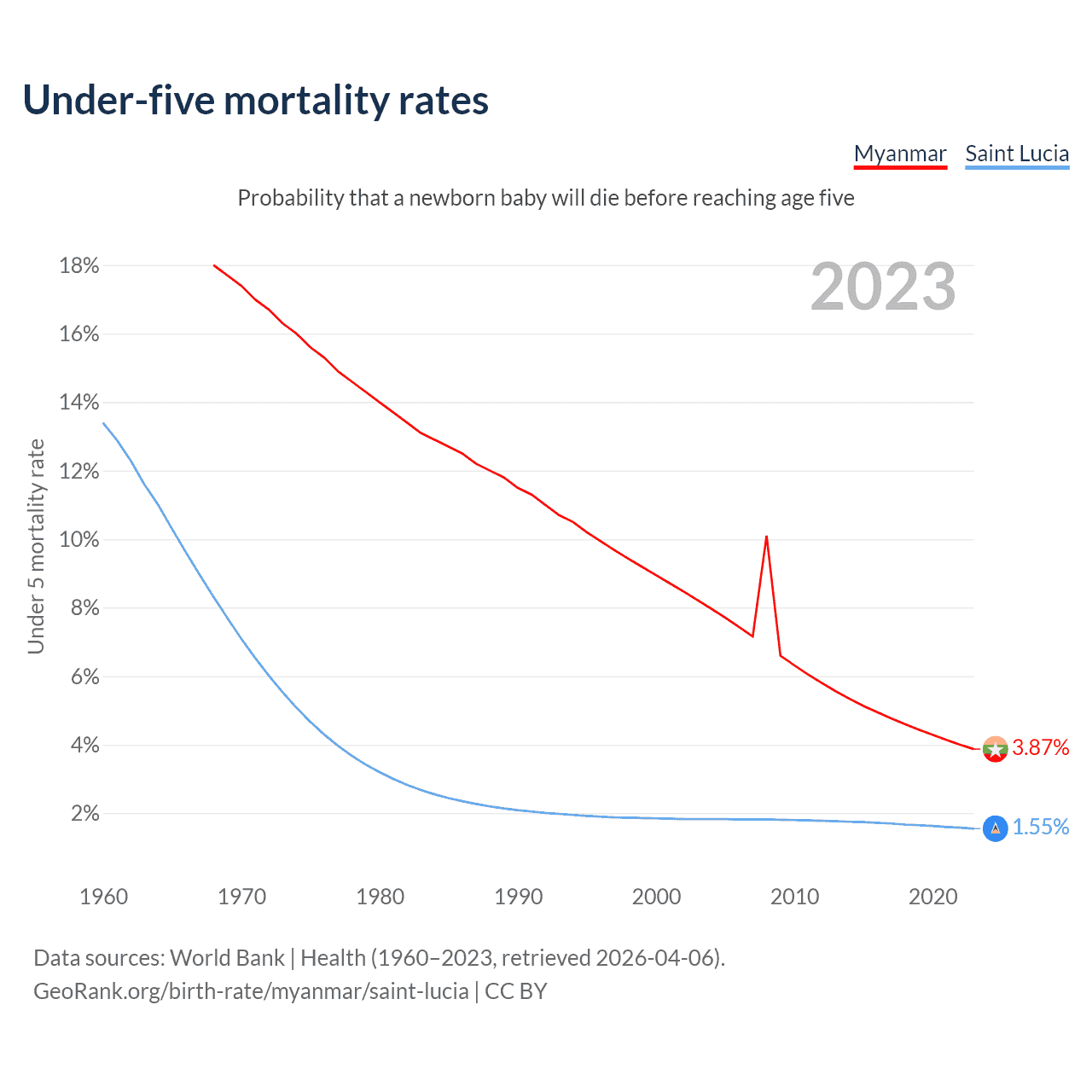 The chance that a newborn baby will die before reaching age five is 3.87% in Myanmar and 1.55% in Saint Lucia. Above is a chart with historical data on under-five mortality rates.