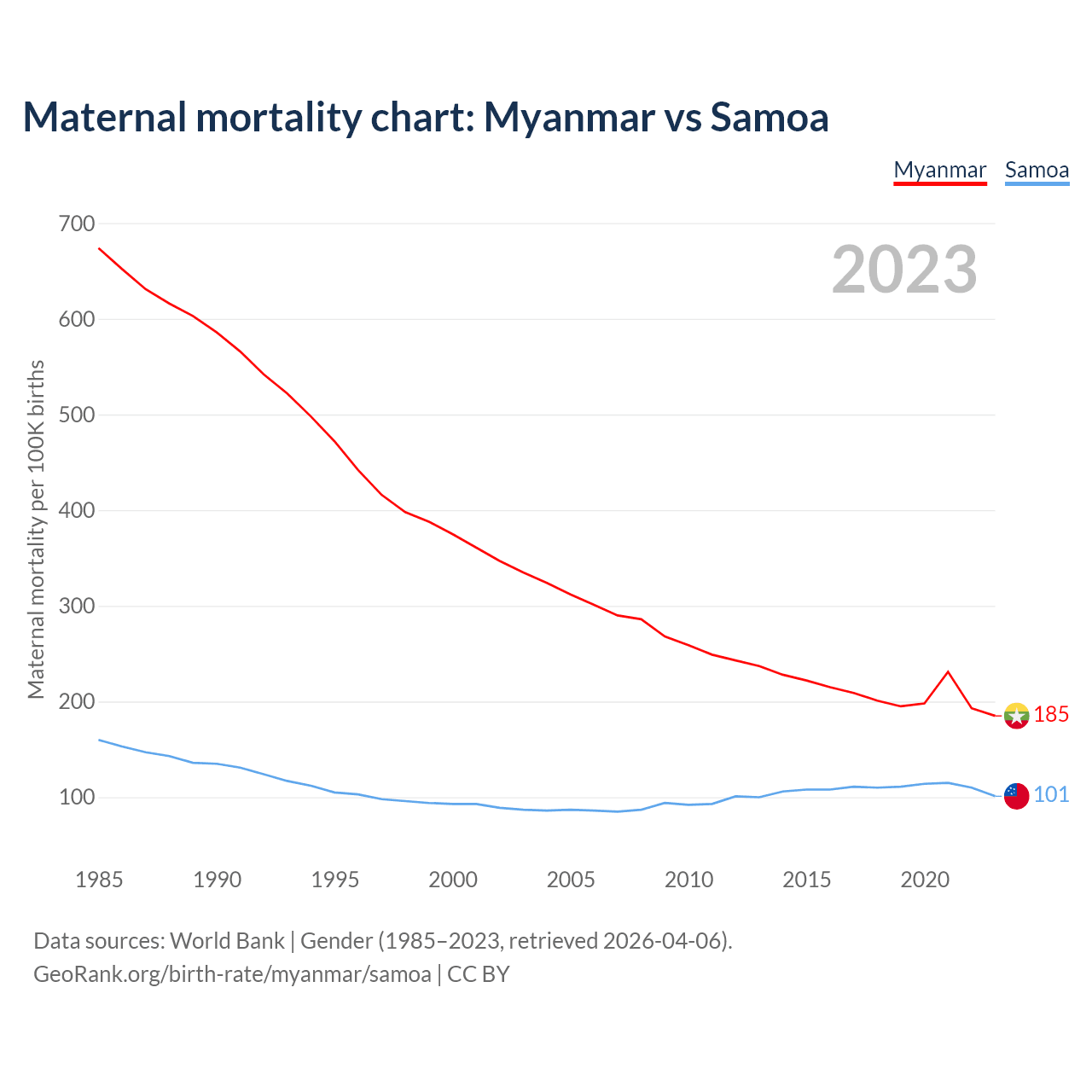 The maternal mortality rate, which is the probability of dying during childbirth or within 42 days of pregnancy termination, is 185 deaths per 100,000 live births in Myanmar, compared to 101 deaths in Samoa.