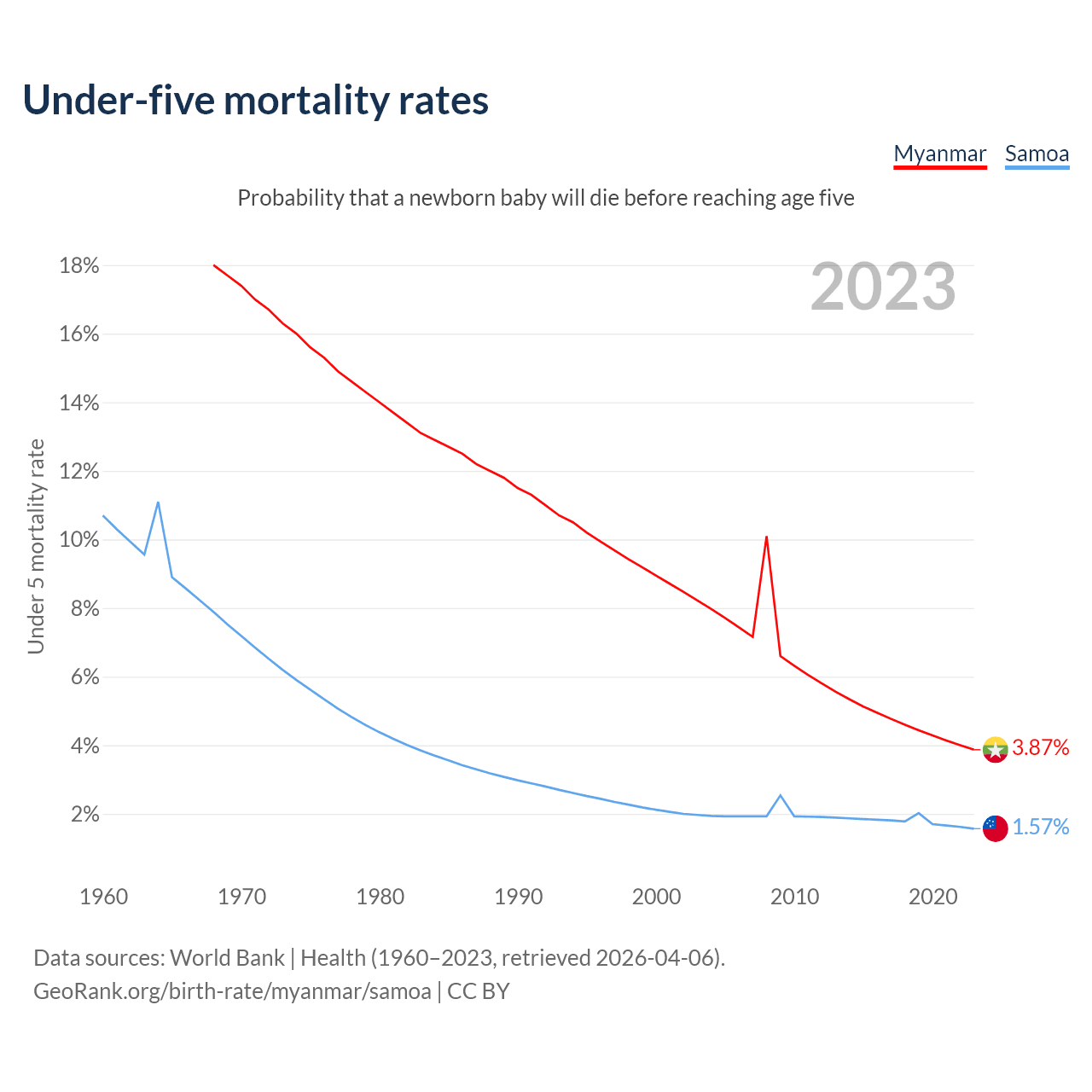 The chance that a newborn baby will die before reaching age five is 3.87% in Myanmar and 1.57% in Samoa. Above is a chart with historical data on under-five mortality rates.