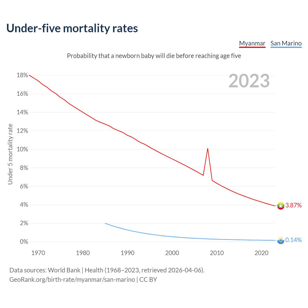 The chance that a newborn baby will die before reaching age five is 3.87% in Myanmar and 0.14% in San Marino. Above is a chart with historical data on under-five mortality rates.