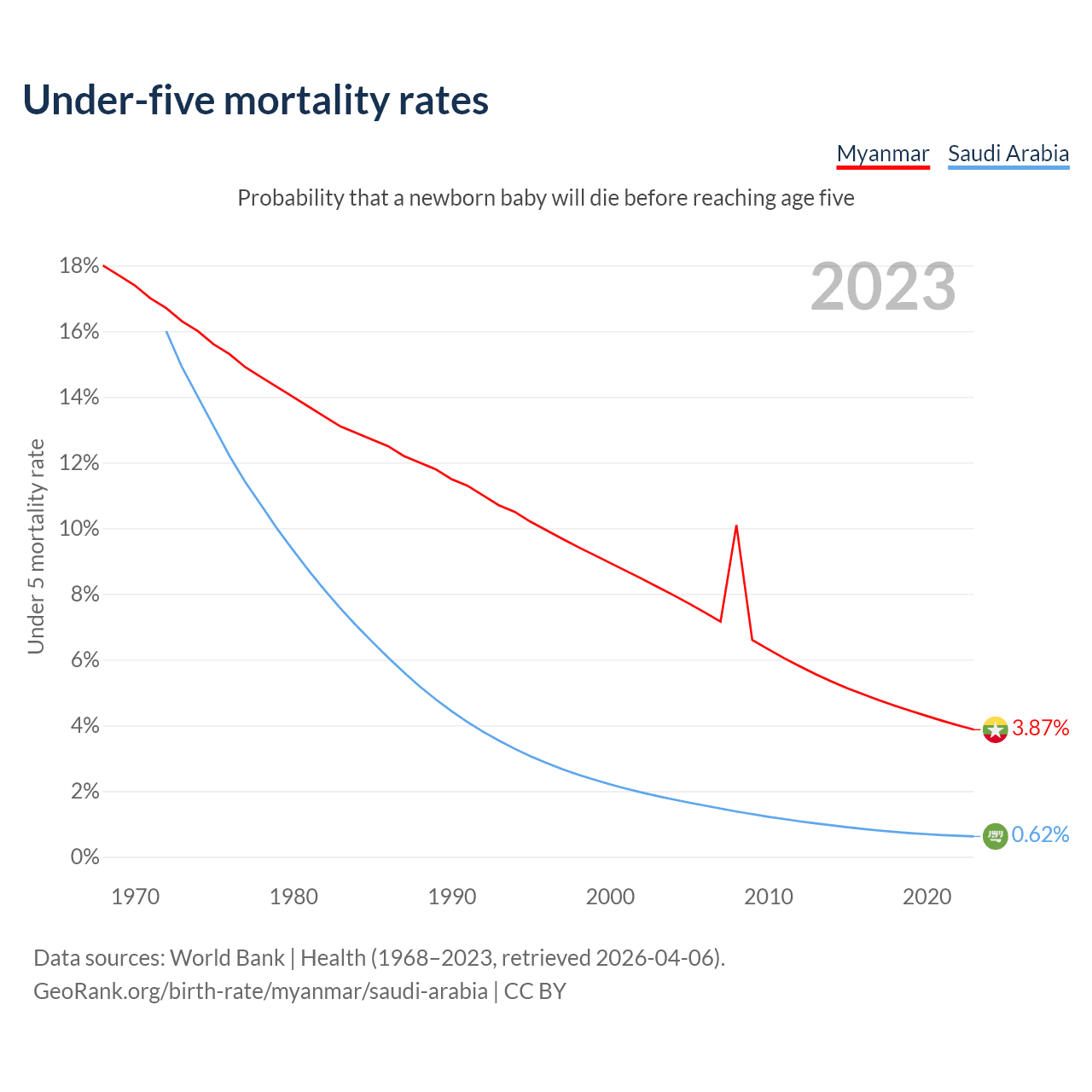 The chance that a newborn baby will die before reaching age five is 3.87% in Myanmar and 0.62% in Saudi Arabia. Above is a chart with historical data on under-five mortality rates.