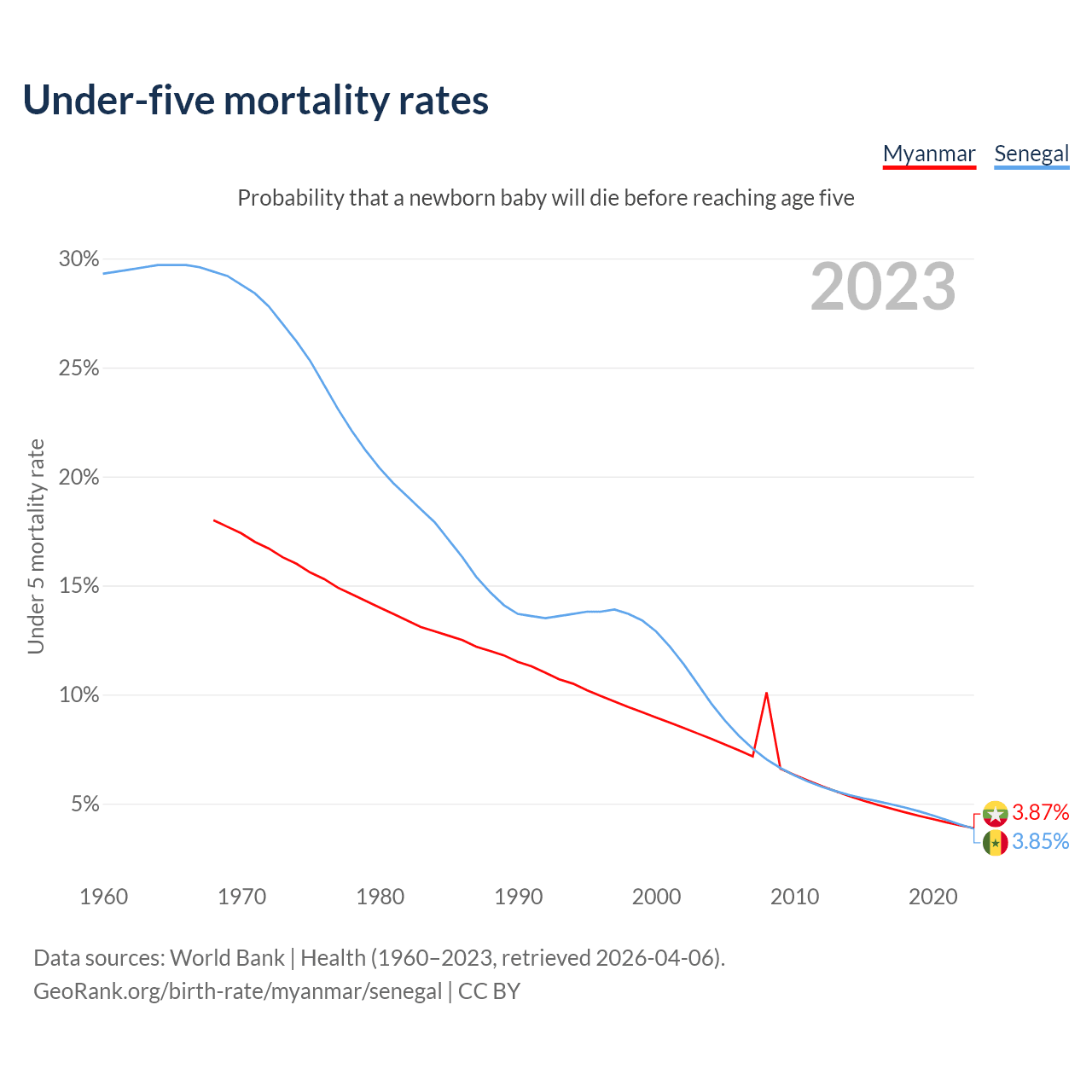 The chance that a newborn baby will die before reaching age five is 3.87% in Myanmar and 3.85% in Senegal. Above is a chart with historical data on under-five mortality rates.