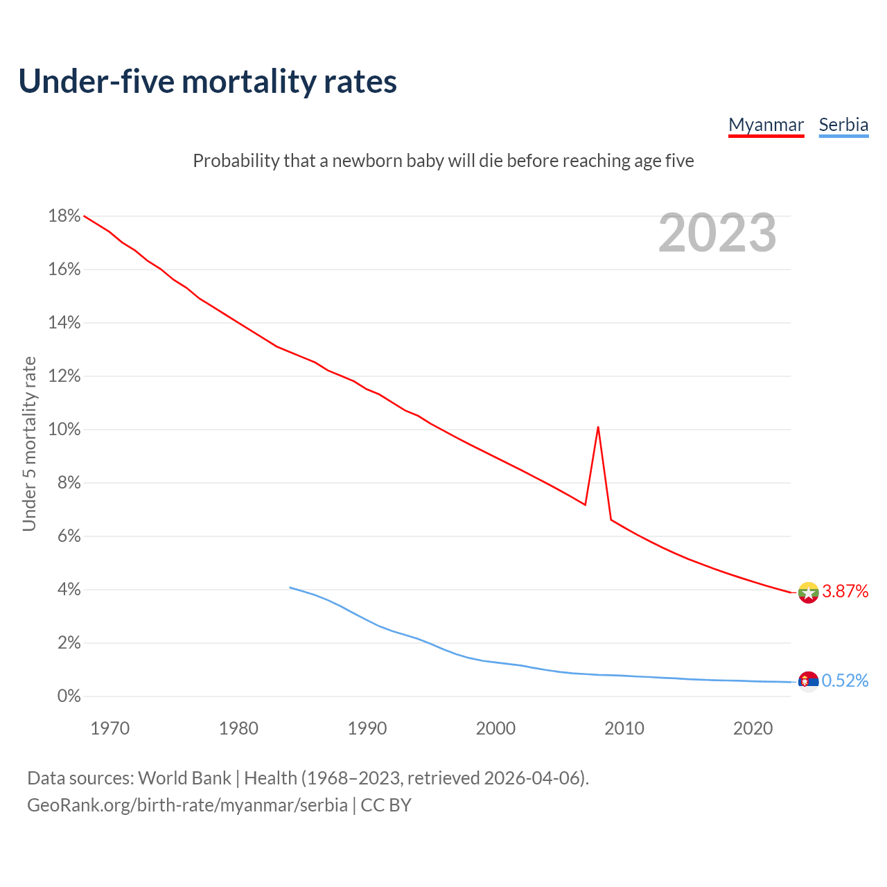 The chance that a newborn baby will die before reaching age five is 3.87% in Myanmar and 0.52% in Serbia. Above is a chart with historical data on under-five mortality rates.