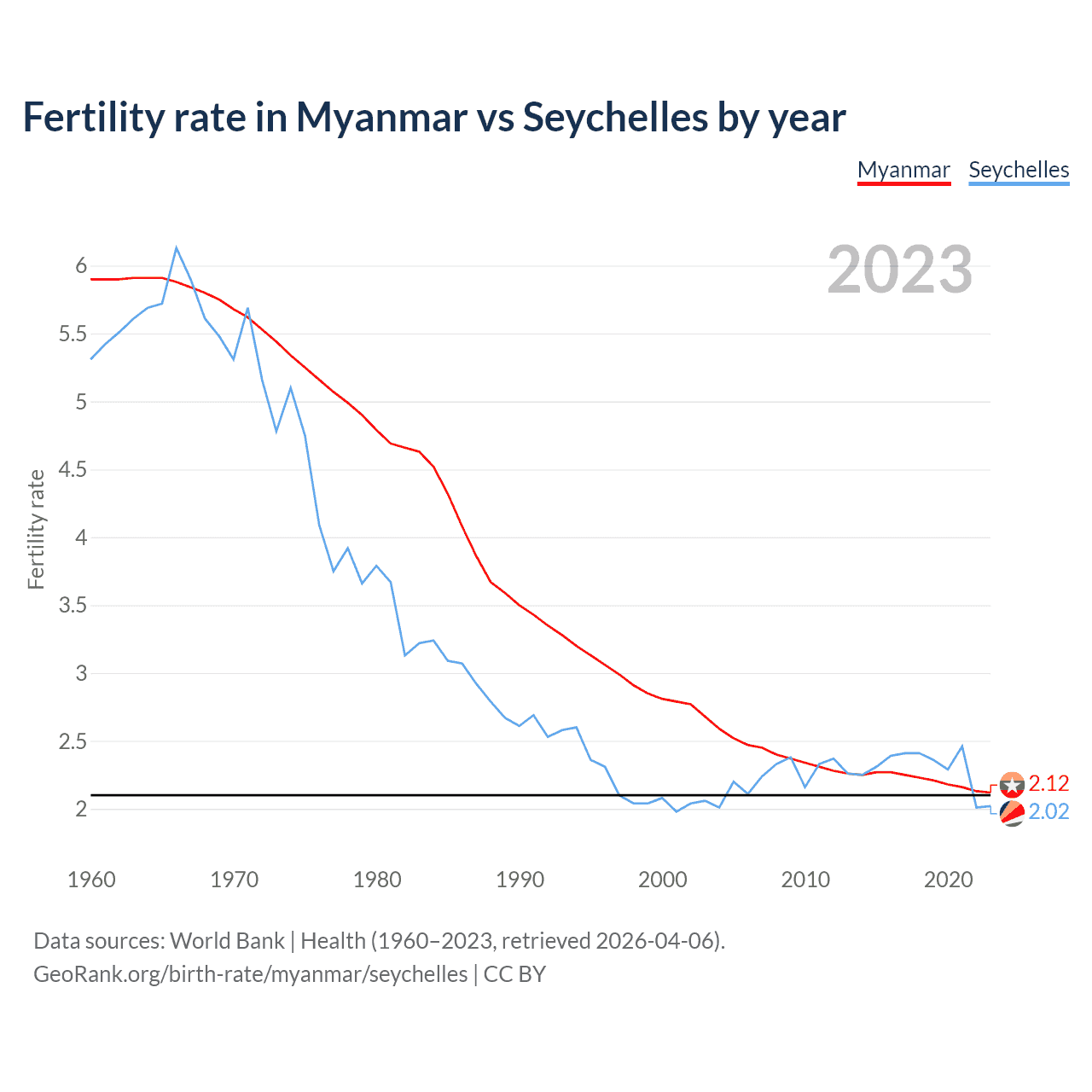 According to the latest available data on birth rates, the fertility rate in Myanmar was 2.12 children per woman in 2023, compared to 2.02 in the Seychelles in 2023. The replacement level is considered to be 2.1 children per woman.