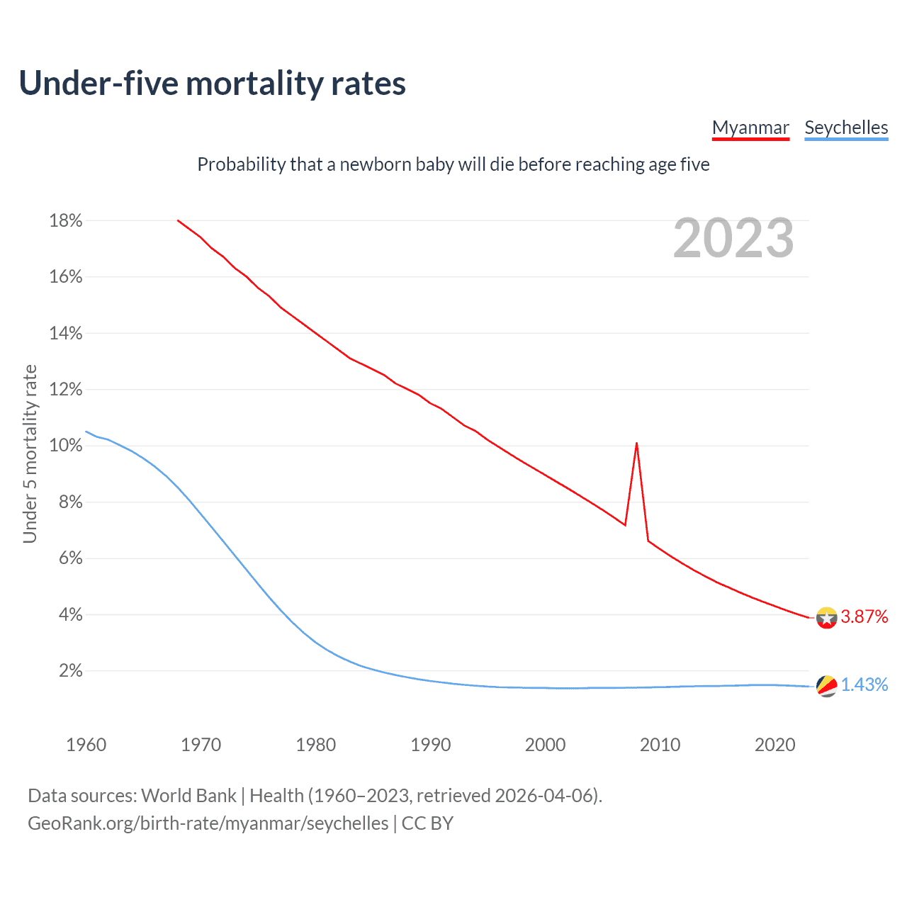 The chance that a newborn baby will die before reaching age five is 3.87% in Myanmar and 1.43% in the Seychelles. Above is a chart with historical data on under-five mortality rates.