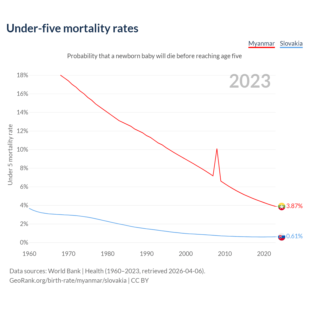 The chance that a newborn baby will die before reaching age five is 3.87% in Myanmar and 0.61% in Slovakia. Above is a chart with historical data on under-five mortality rates.