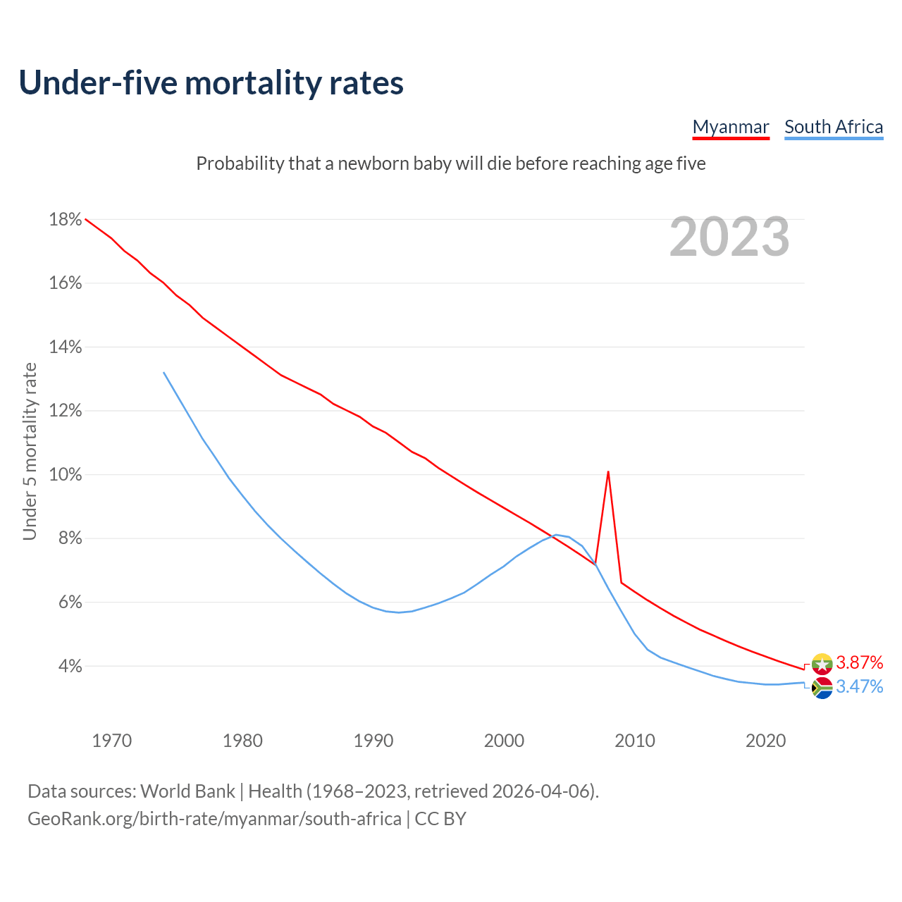 The chance that a newborn baby will die before reaching age five is 3.87% in Myanmar and 3.47% in South Africa. Above is a chart with historical data on under-five mortality rates.