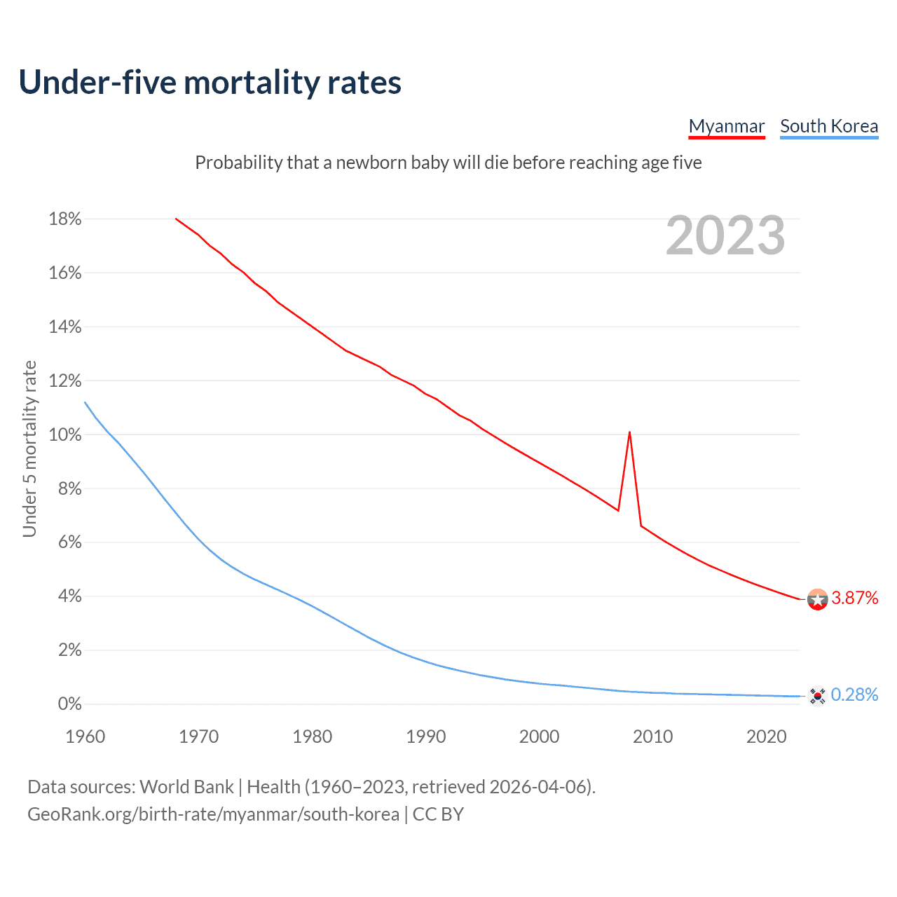 The chance that a newborn baby will die before reaching age five is 3.87% in Myanmar and 0.28% in South Korea. Above is a chart with historical data on under-five mortality rates.