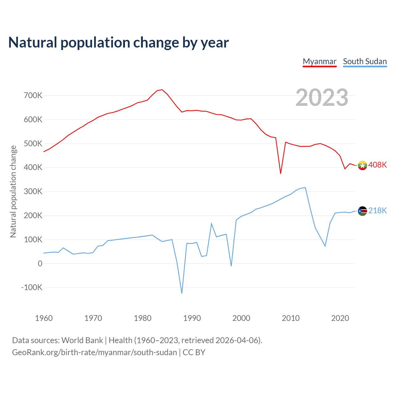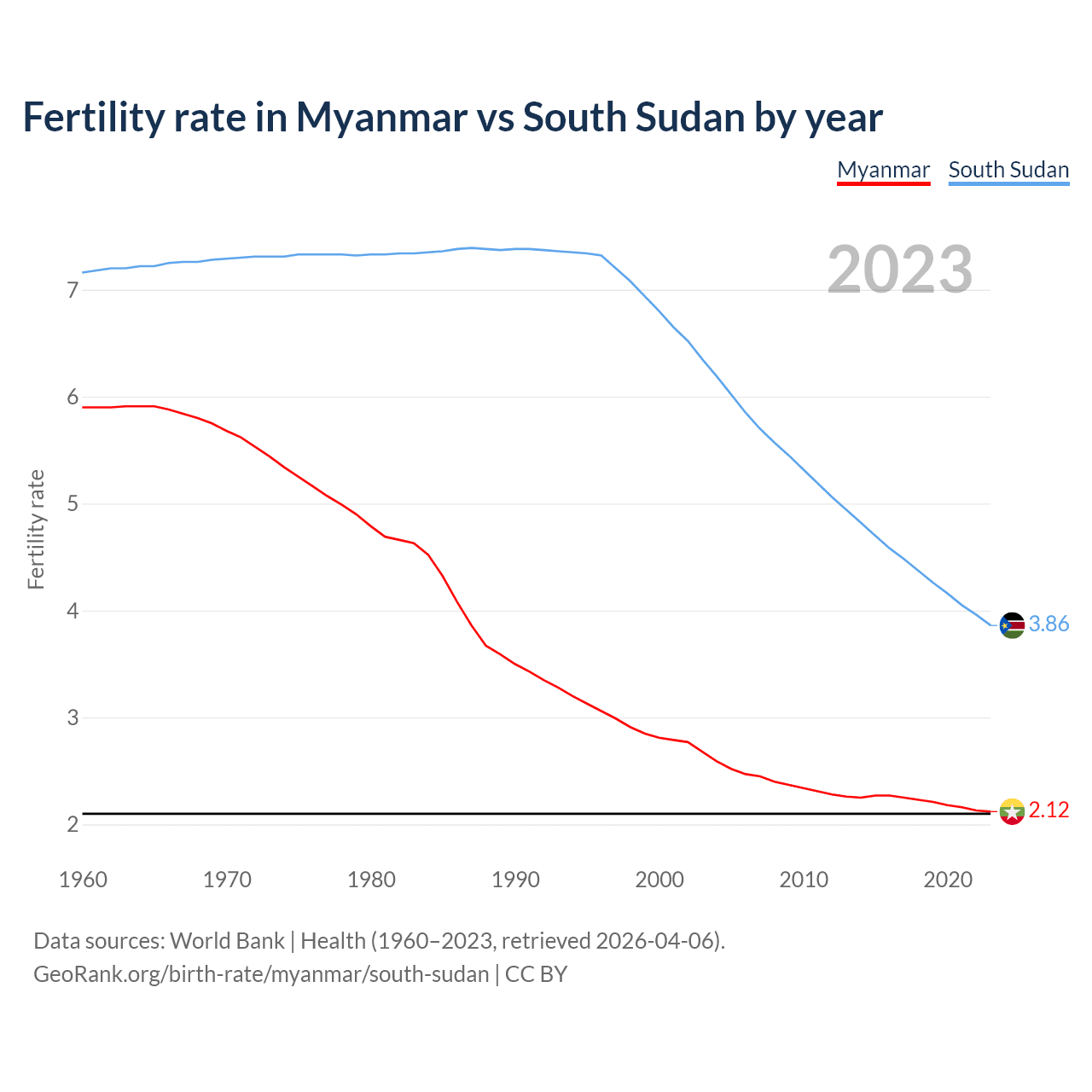 According to the latest available data on birth rates, the fertility rate in Myanmar was 2.12 children per woman in 2023, compared to 3.86 in South Sudan in 2023. The replacement level is considered to be 2.1 children per woman.