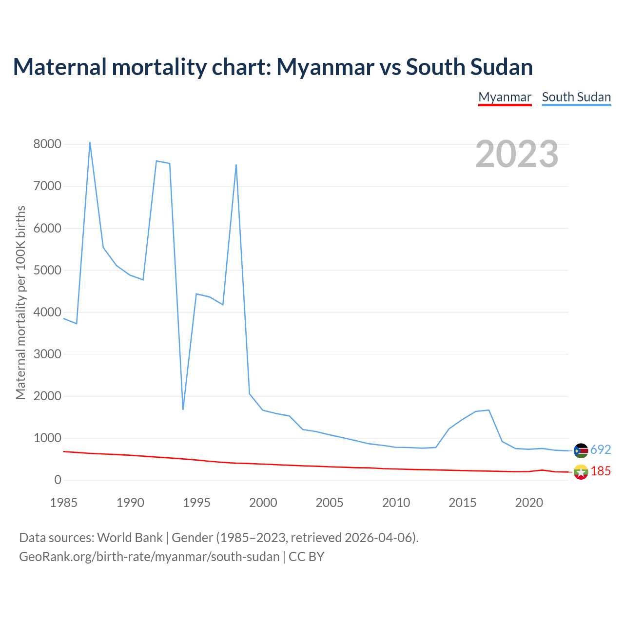 The maternal mortality rate, which is the probability of dying during childbirth or within 42 days of pregnancy termination, is 185 deaths per 100,000 live births in Myanmar, compared to 692 deaths in South Sudan.