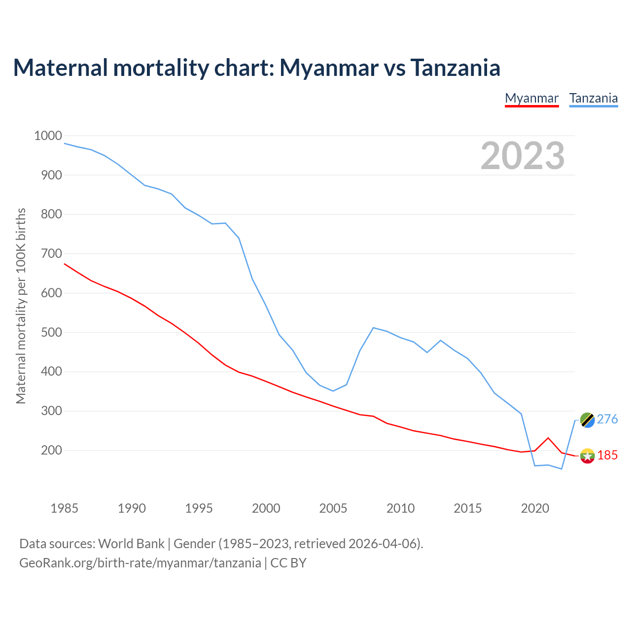 The maternal mortality rate, which is the probability of dying during childbirth or within 42 days of pregnancy termination, is 185 deaths per 100,000 live births in Myanmar, compared to 276 deaths in Tanzania.