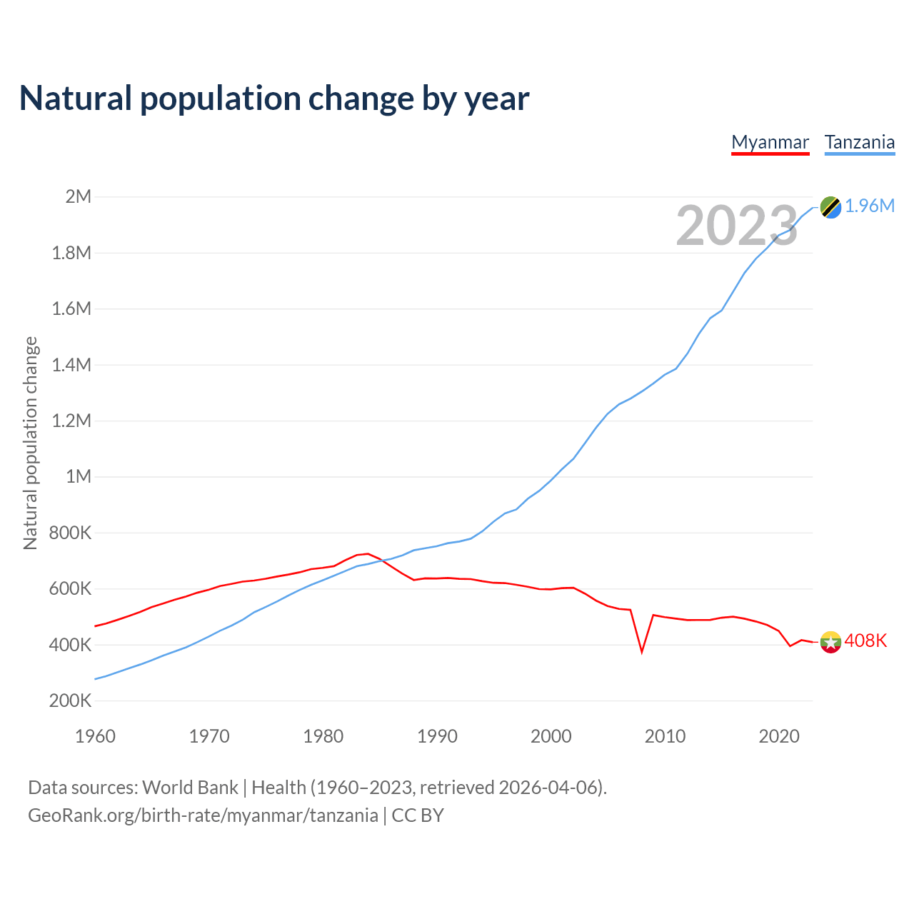 According to the latest available data on birth rates, the fertility rate in Myanmar was 2.12 children per woman in 2023, compared to 4.61 in Tanzania in 2023. The replacement level is considered to be 2.1 children per woman.