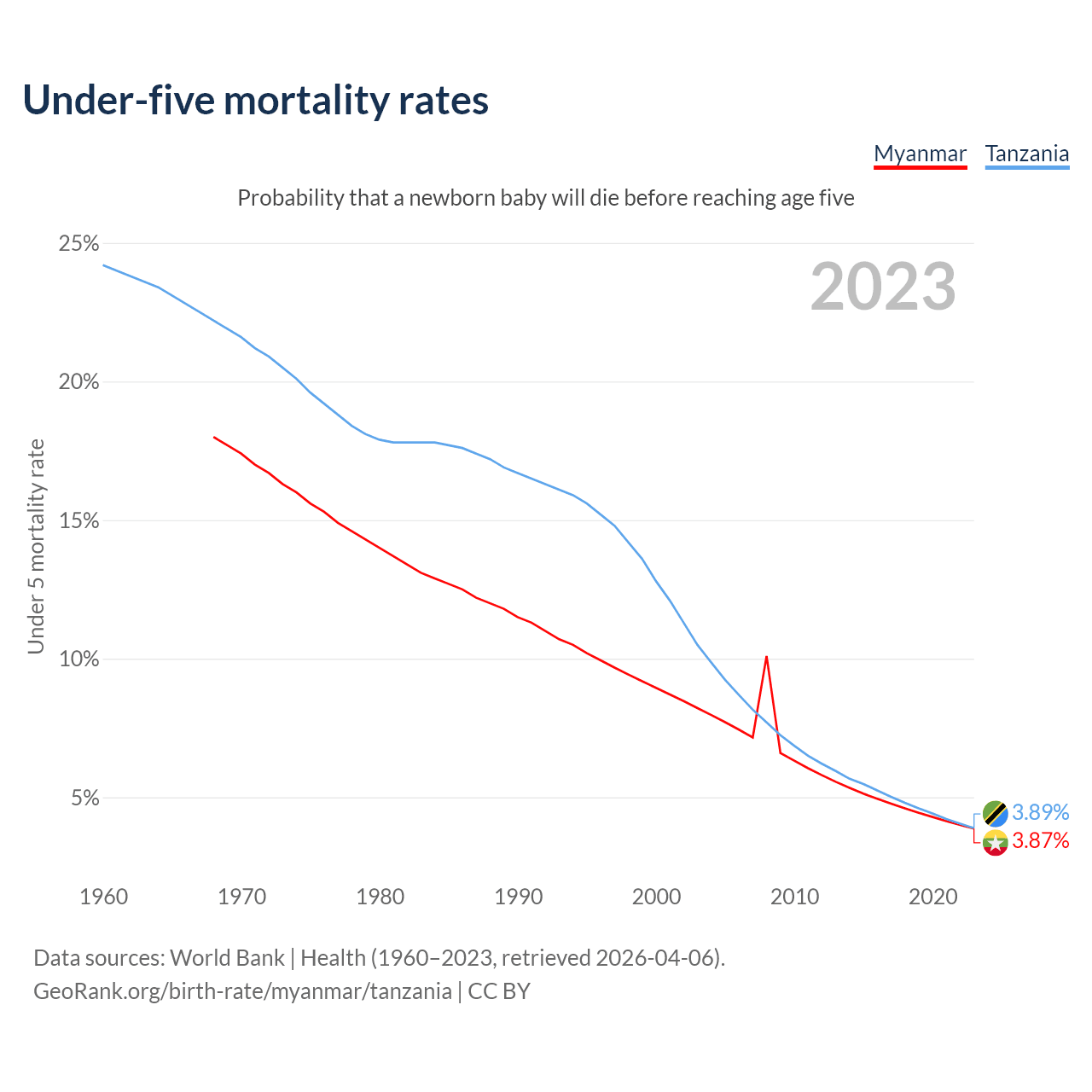 The chance that a newborn baby will die before reaching age five is 3.87% in Myanmar and 3.89% in Tanzania. Above is a chart with historical data on under-five mortality rates.