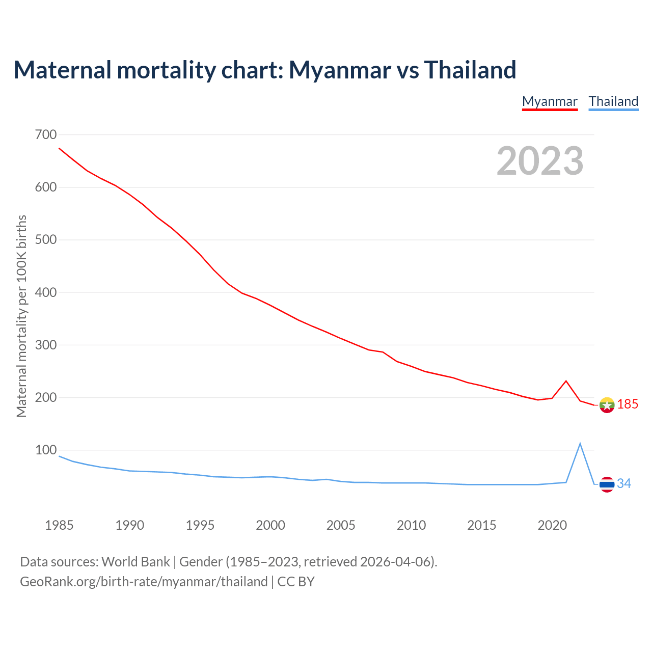The maternal mortality rate, which is the probability of dying during childbirth or within 42 days of pregnancy termination, is 185 deaths per 100,000 live births in Myanmar, compared to 34 deaths in Thailand.