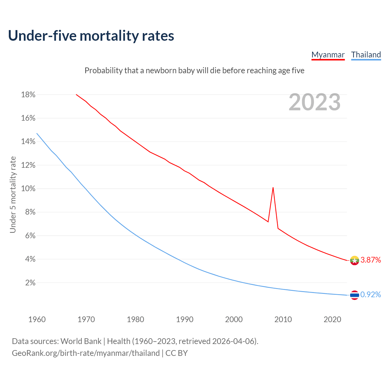 The chance that a newborn baby will die before reaching age five is 3.87% in Myanmar and 0.92% in Thailand. Above is a chart with historical data on under-five mortality rates.