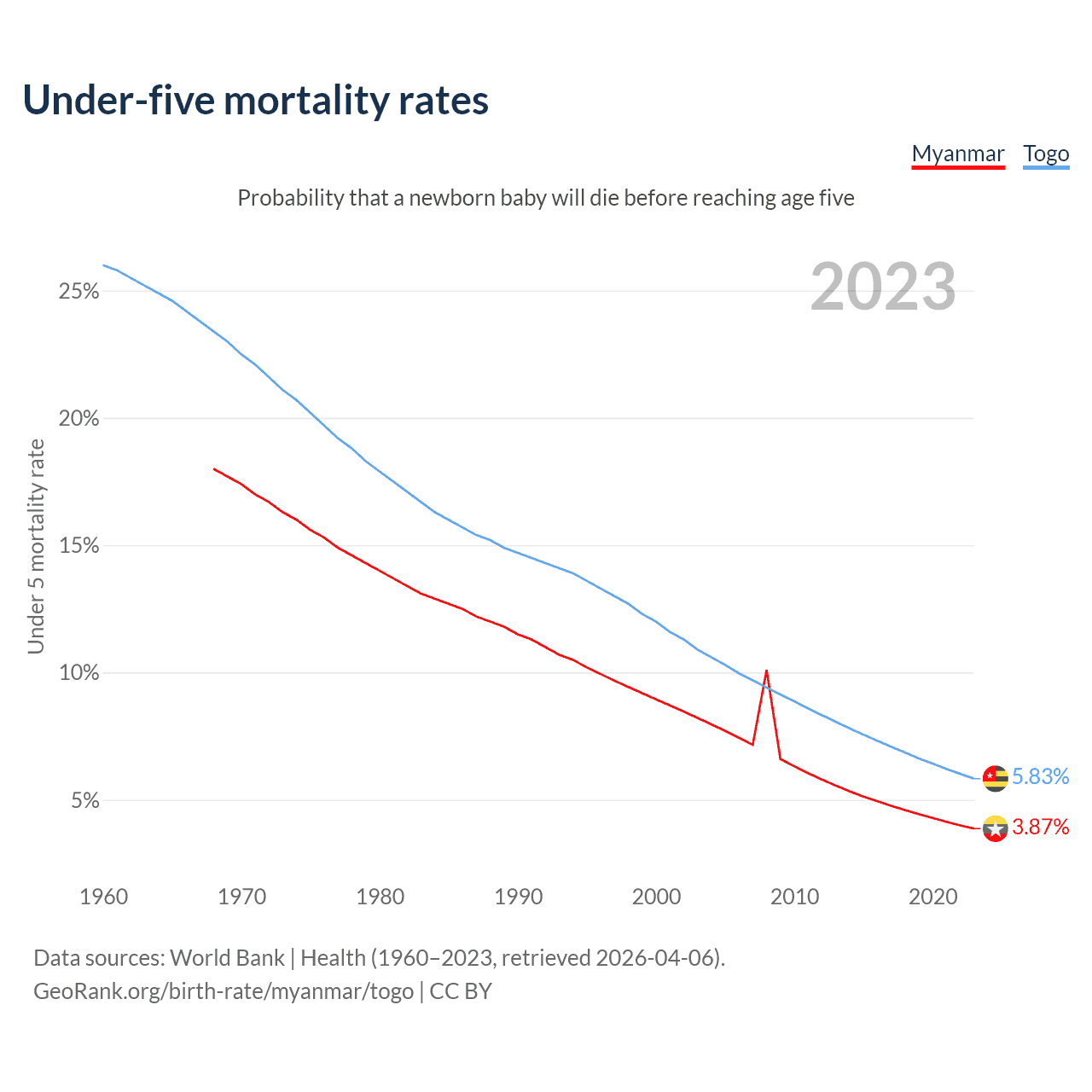 The chance that a newborn baby will die before reaching age five is 3.87% in Myanmar and 5.83% in Togo. Above is a chart with historical data on under-five mortality rates.