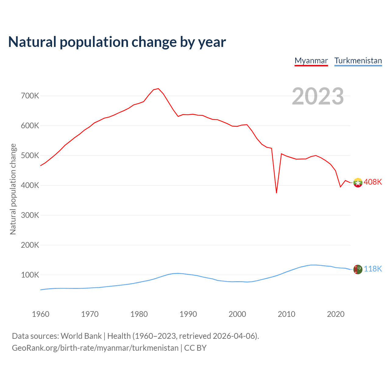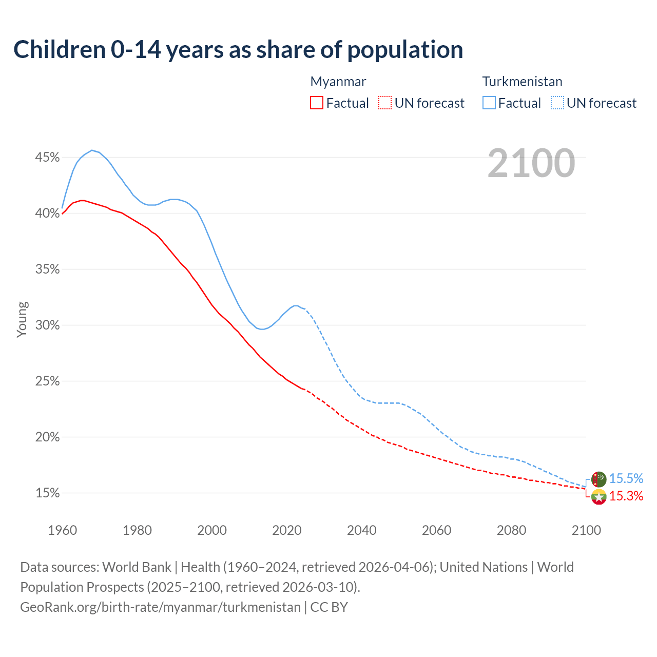According to the latest available data on birth rates, the fertility rate in Myanmar was 2.12 children per woman in 2023, compared to 2.69 in Turkmenistan in 2023. The replacement level is considered to be 2.1 children per woman.