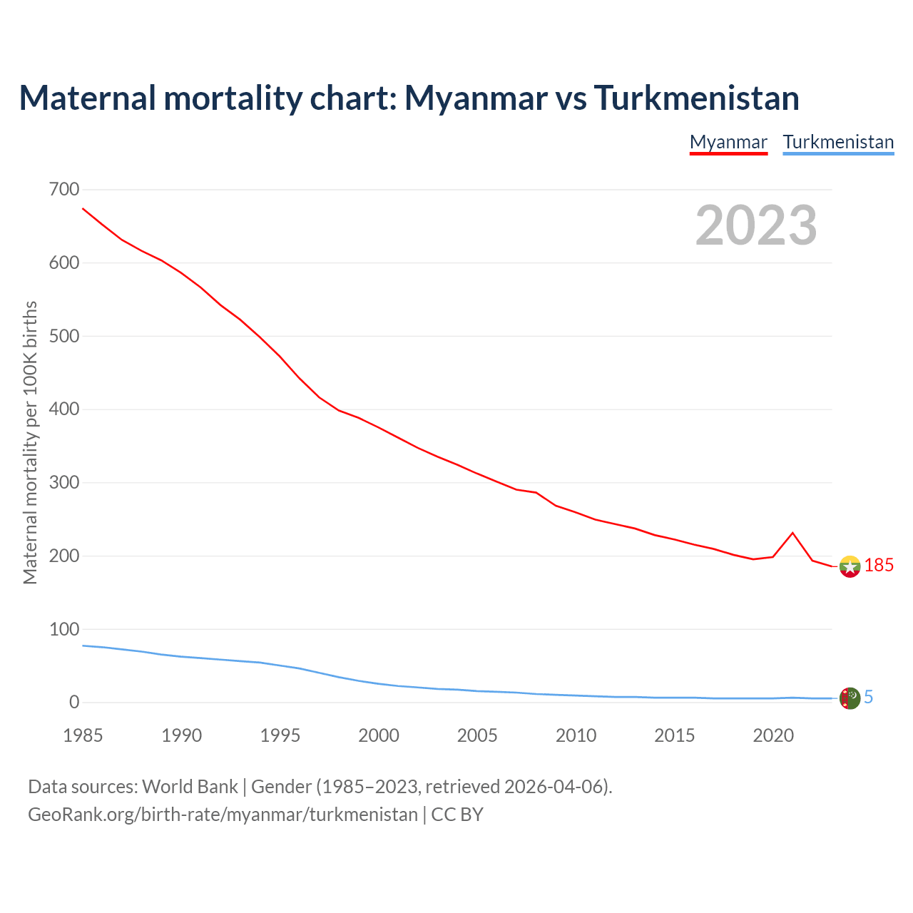 The maternal mortality rate, which is the probability of dying during childbirth or within 42 days of pregnancy termination, is 185 deaths per 100,000 live births in Myanmar, compared to 5 deaths in Turkmenistan.