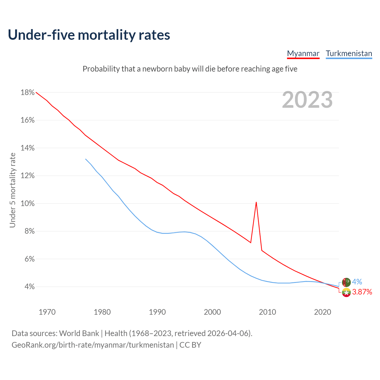 The chance that a newborn baby will die before reaching age five is 3.87% in Myanmar and 4% in Turkmenistan. Above is a chart with historical data on under-five mortality rates.