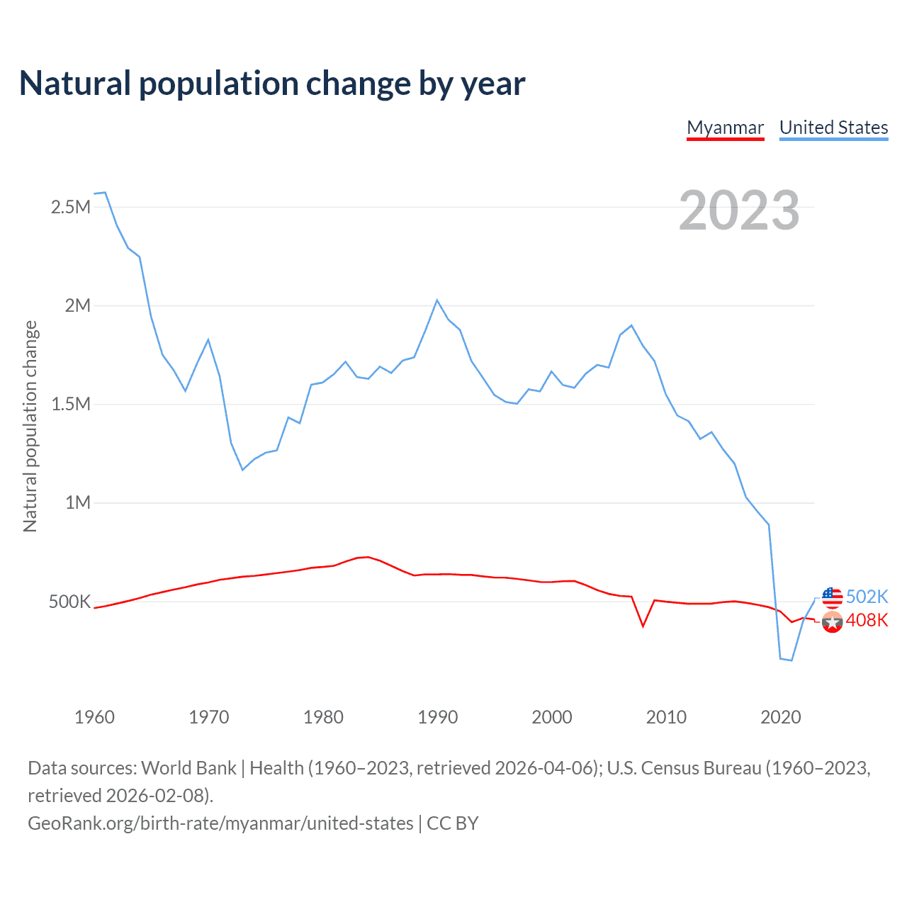 According to the latest available data on birth rates, the fertility rate in Myanmar was 2.12 children per woman in 2023, compared to 1.62 in the United States in 2023. The replacement level is considered to be 2.1 children per woman.