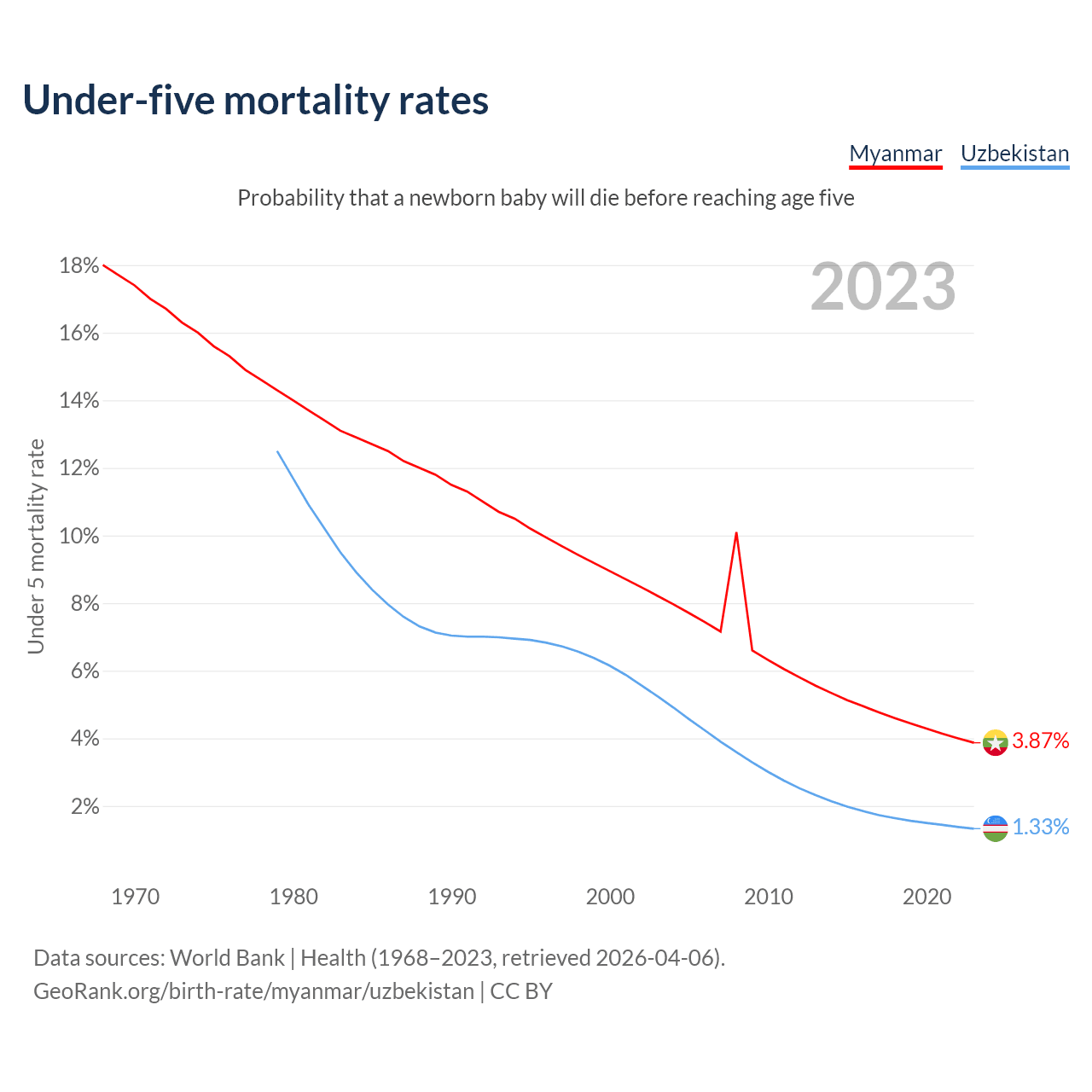 The chance that a newborn baby will die before reaching age five is 3.87% in Myanmar and 1.33% in Uzbekistan. Above is a chart with historical data on under-five mortality rates.
