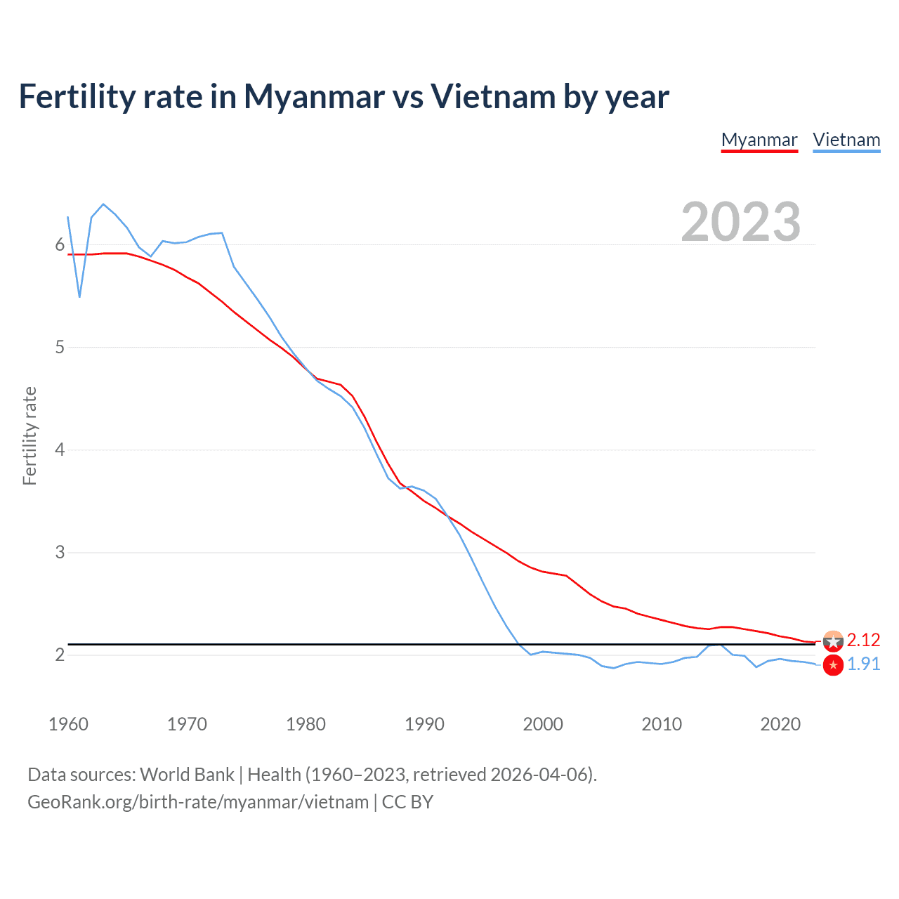 According to the latest available data on birth rates, the fertility rate in Myanmar was 2.12 children per woman in 2023, compared to 1.91 in Vietnam in 2023. The replacement level is considered to be 2.1 children per woman.