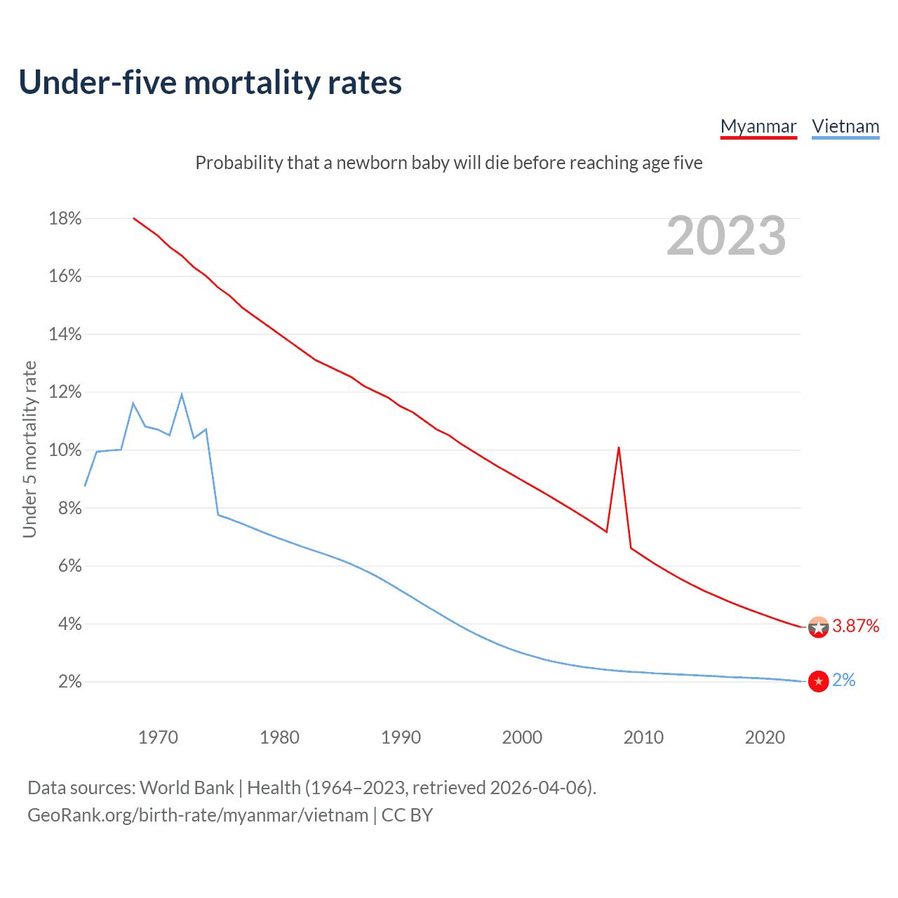 The chance that a newborn baby will die before reaching age five is 3.87% in Myanmar and 2% in Vietnam. Above is a chart with historical data on under-five mortality rates.