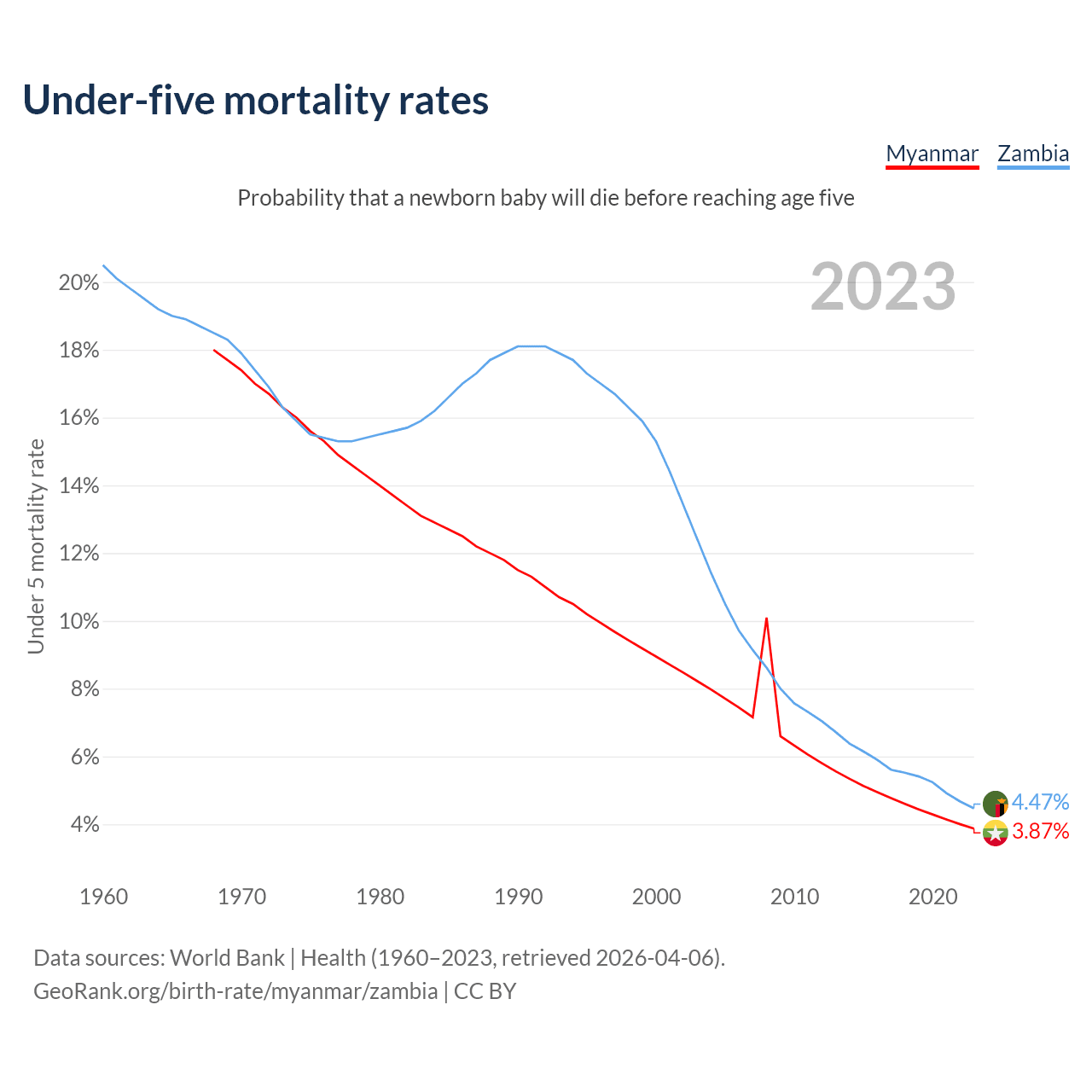The chance that a newborn baby will die before reaching age five is 3.87% in Myanmar and 4.47% in Zambia. Above is a chart with historical data on under-five mortality rates.