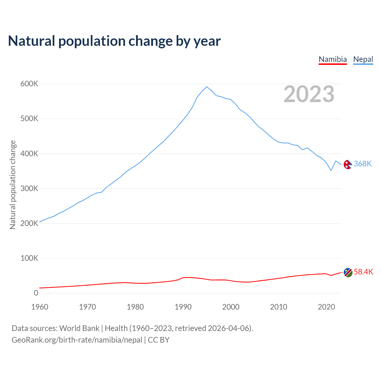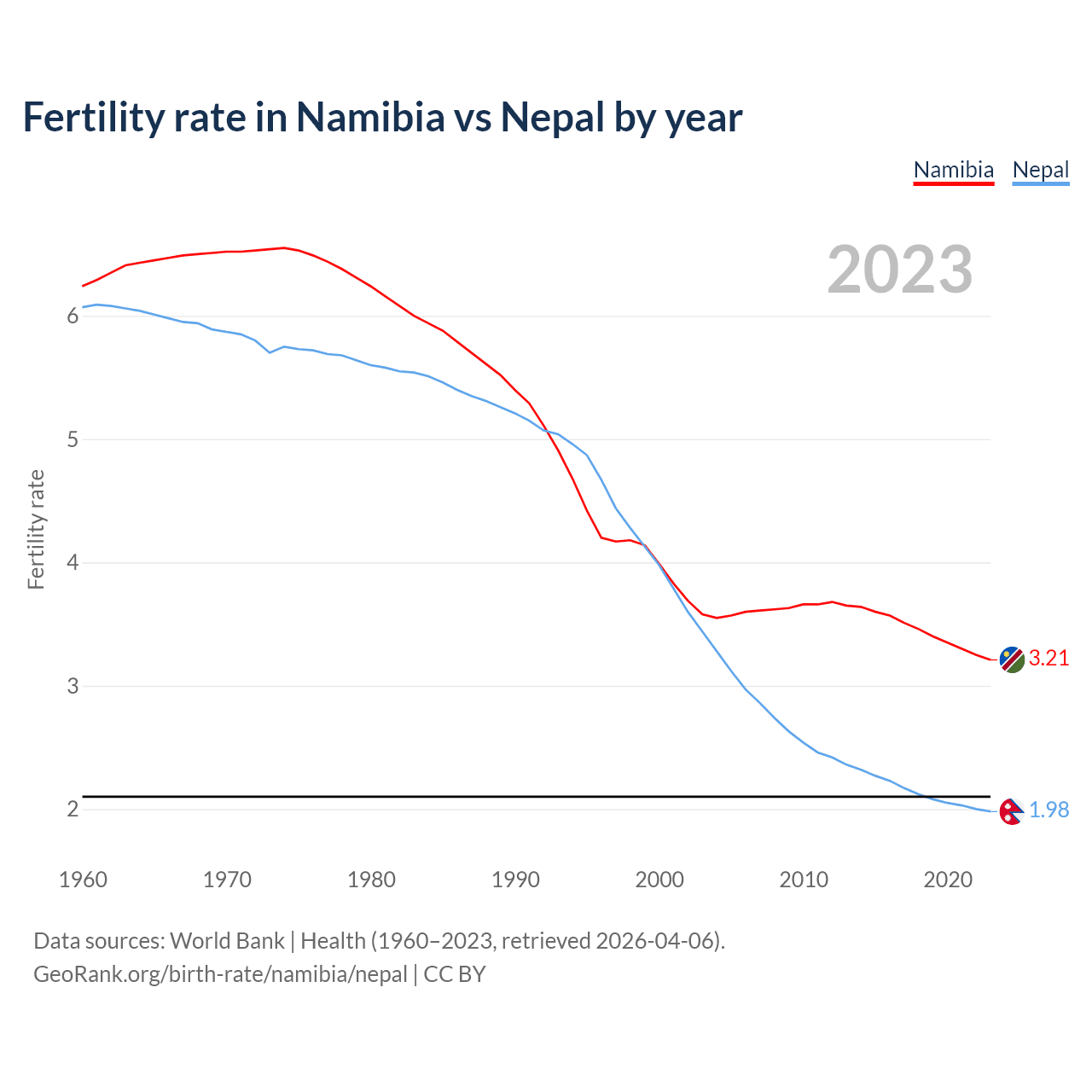 According to the latest available data on birth rates, the fertility rate in Namibia was 3.21 children per woman in 2023, compared to 1.98 in Nepal in 2023. The replacement level is considered to be 2.1 children per woman.
