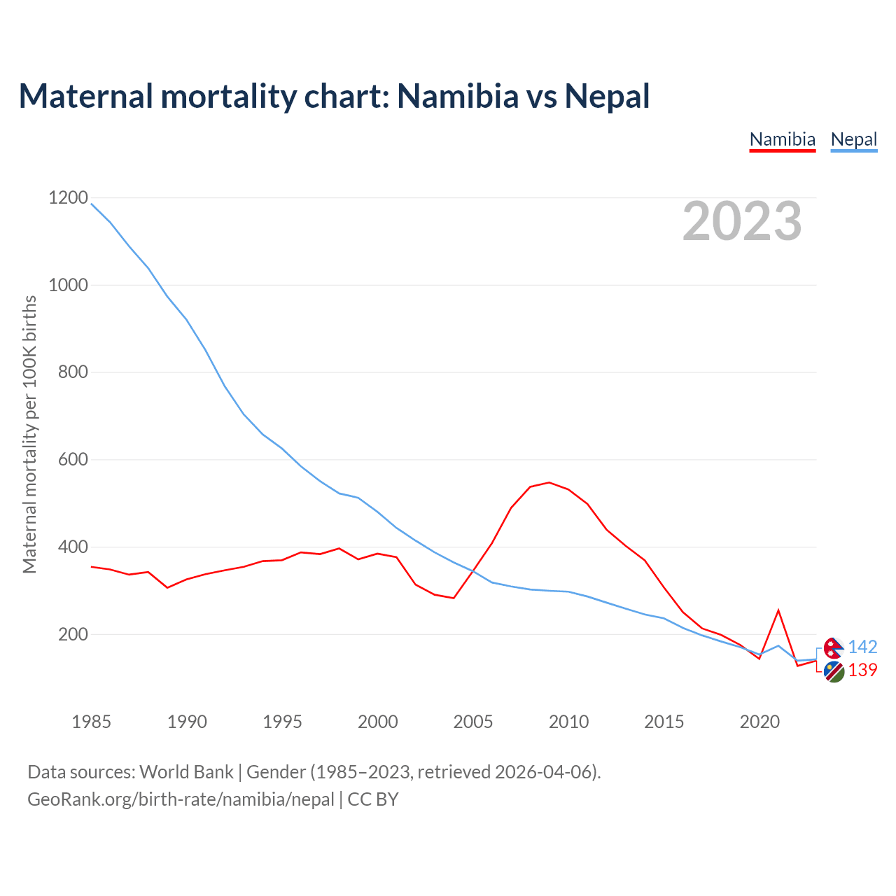 The maternal mortality rate, which is the probability of dying during childbirth or within 42 days of pregnancy termination, is 139 deaths per 100,000 live births in Namibia, compared to 142 deaths in Nepal.