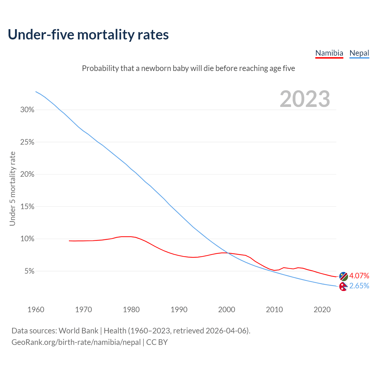 The chance that a newborn baby will die before reaching age five is 4.07% in Namibia and 2.65% in Nepal. Above is a chart with historical data on under-five mortality rates.