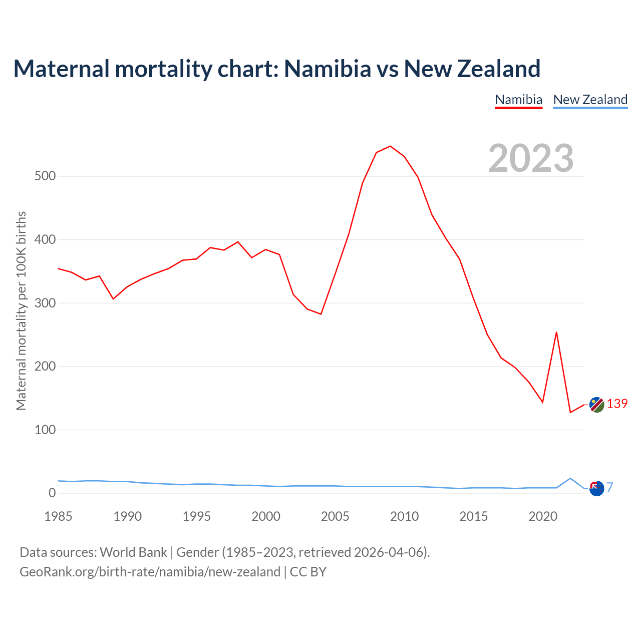 The maternal mortality rate, which is the probability of dying during childbirth or within 42 days of pregnancy termination, is 139 deaths per 100,000 live births in Namibia, compared to 7 deaths in New Zealand.