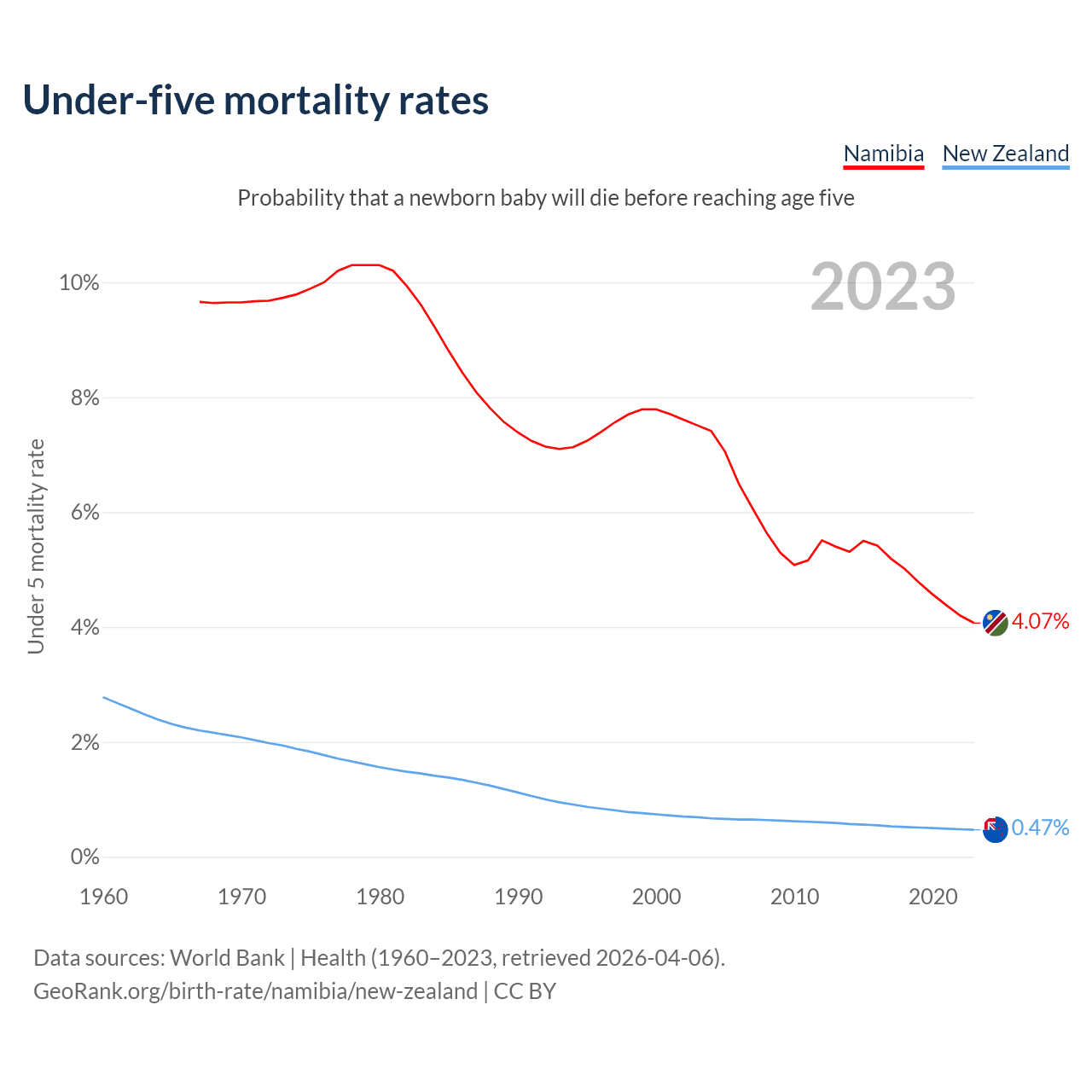 The chance that a newborn baby will die before reaching age five is 4.07% in Namibia and 0.47% in New Zealand. Above is a chart with historical data on under-five mortality rates.