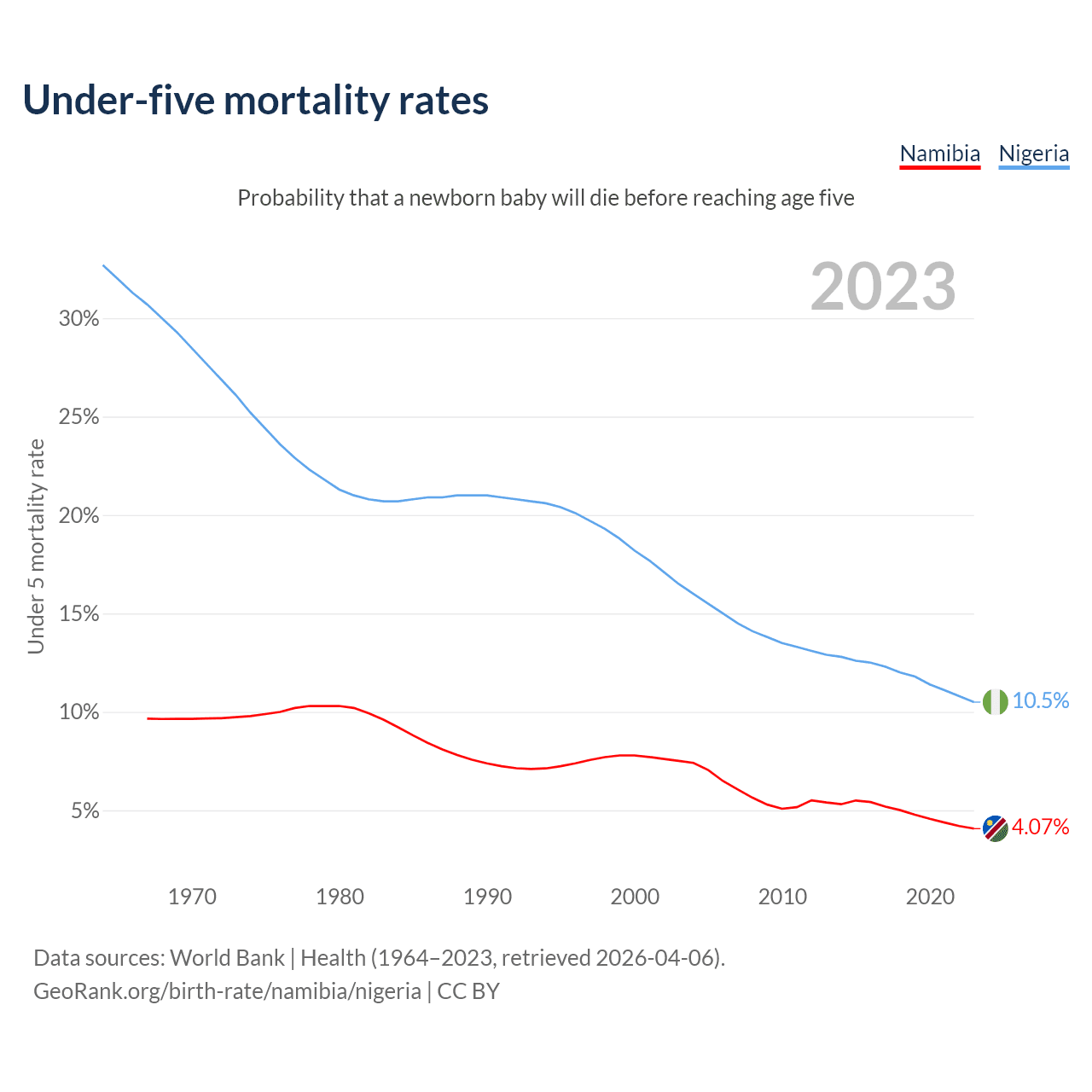 The chance that a newborn baby will die before reaching age five is 4.07% in Namibia and 10.5% in Nigeria. Above is a chart with historical data on under-five mortality rates.