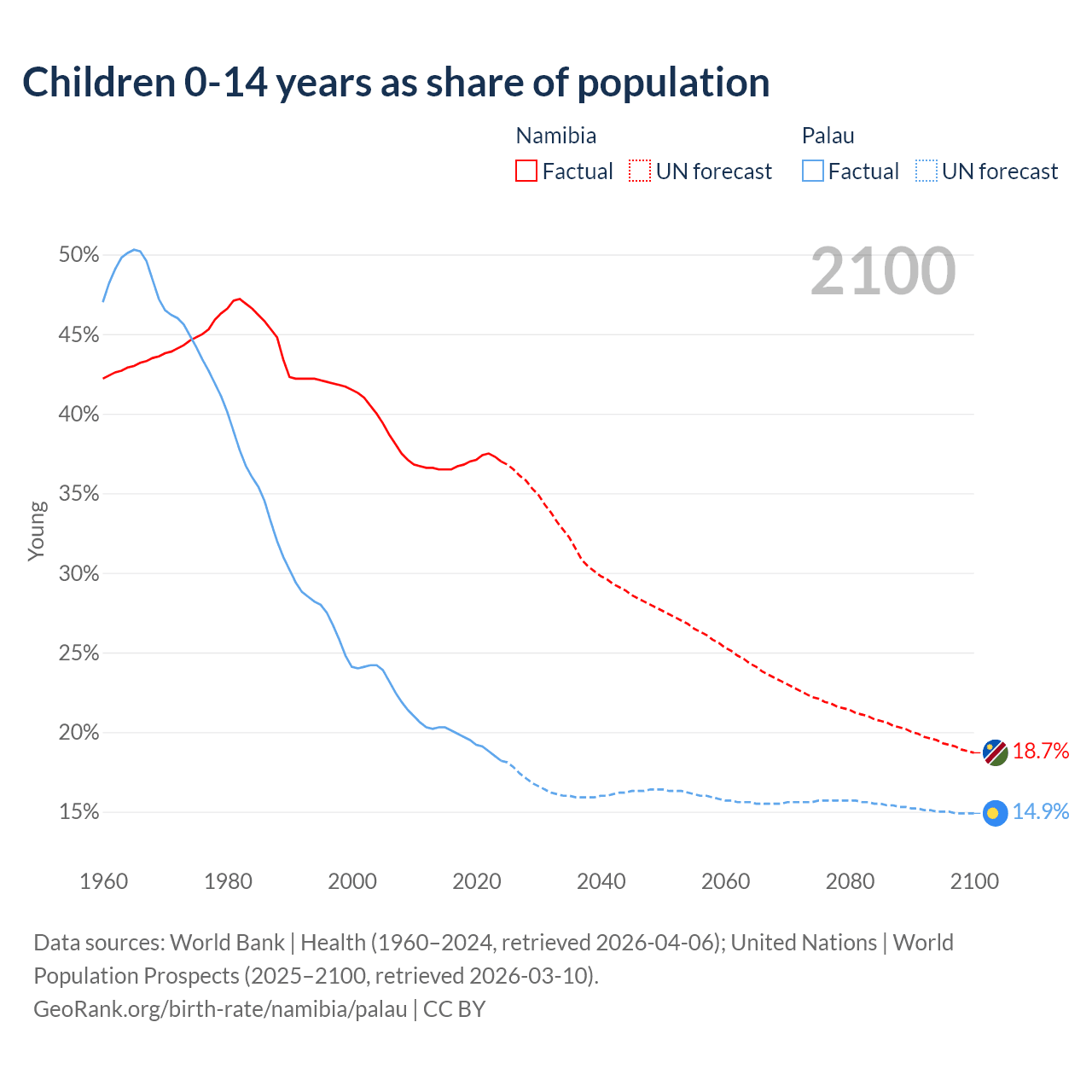 According to the latest available data on birth rates, the fertility rate in Namibia was 3.21 children per woman in 2023, compared to 1.91 in Palau in 2023. The replacement level is considered to be 2.1 children per woman.