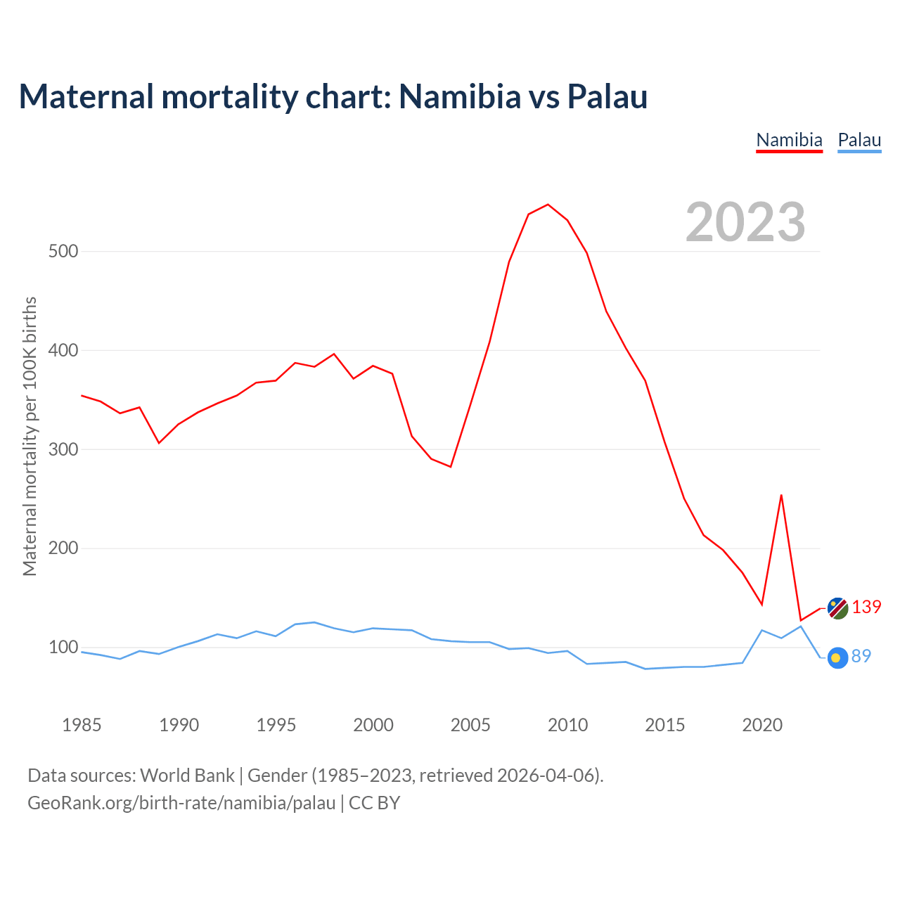 The maternal mortality rate, which is the probability of dying during childbirth or within 42 days of pregnancy termination, is 139 deaths per 100,000 live births in Namibia, compared to 89 deaths in Palau.
