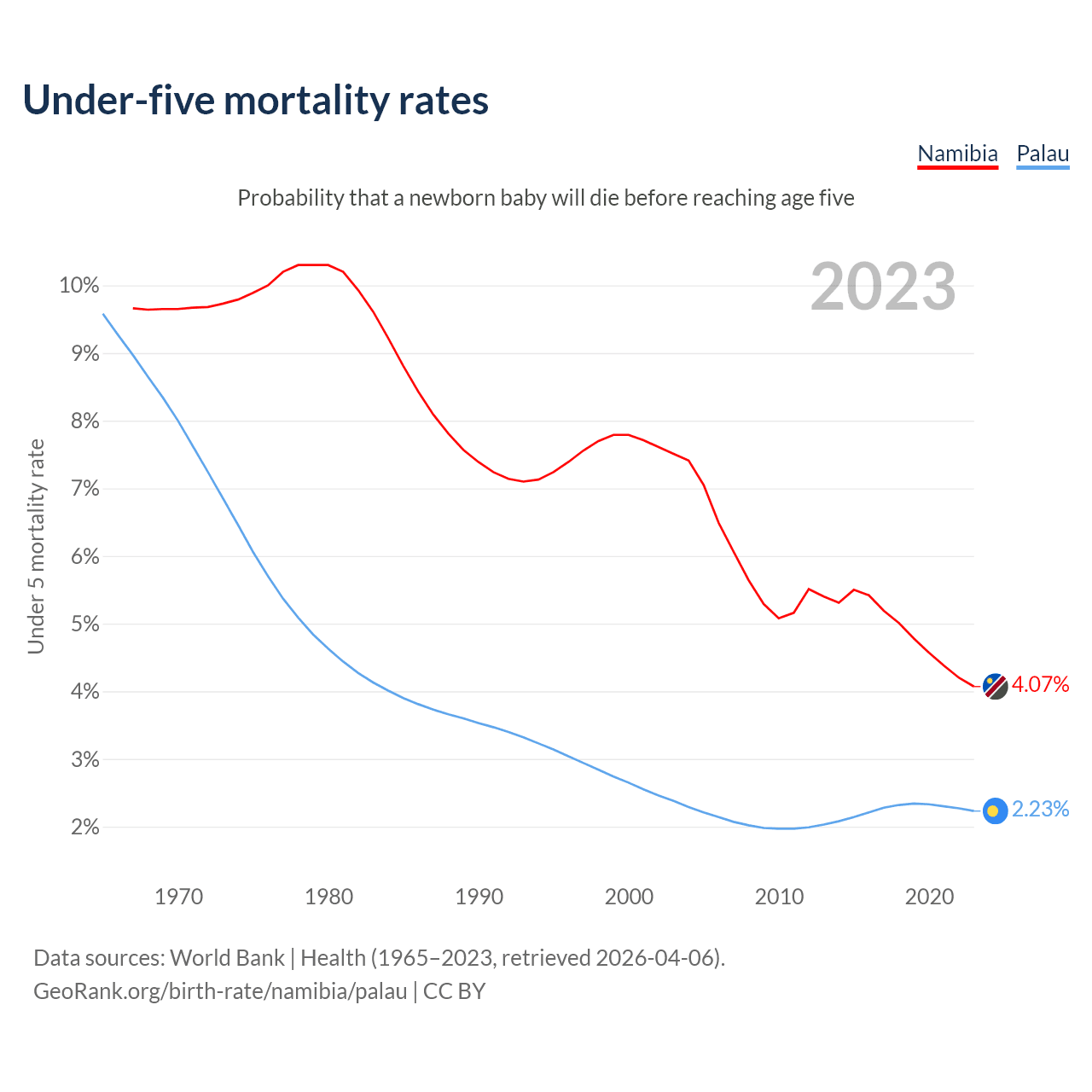 The chance that a newborn baby will die before reaching age five is 4.07% in Namibia and 2.23% in Palau. Above is a chart with historical data on under-five mortality rates.