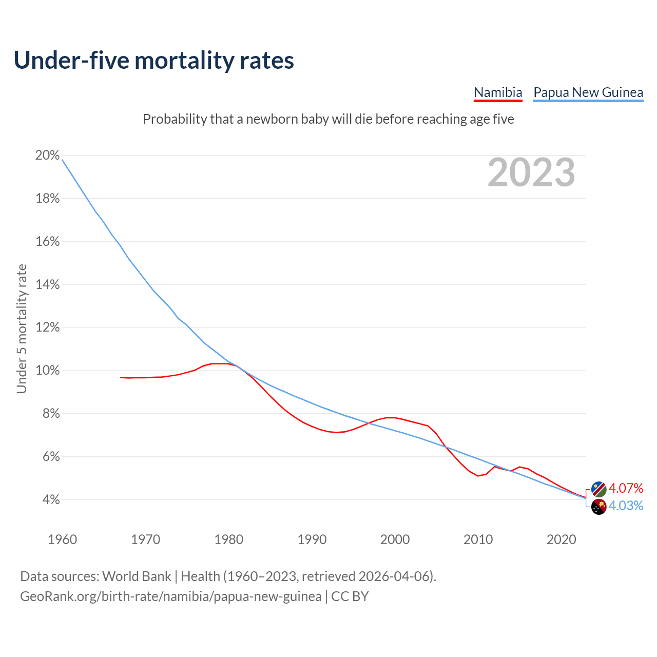 The chance that a newborn baby will die before reaching age five is 4.07% in Namibia and 4.03% in Papua New Guinea. Above is a chart with historical data on under-five mortality rates.