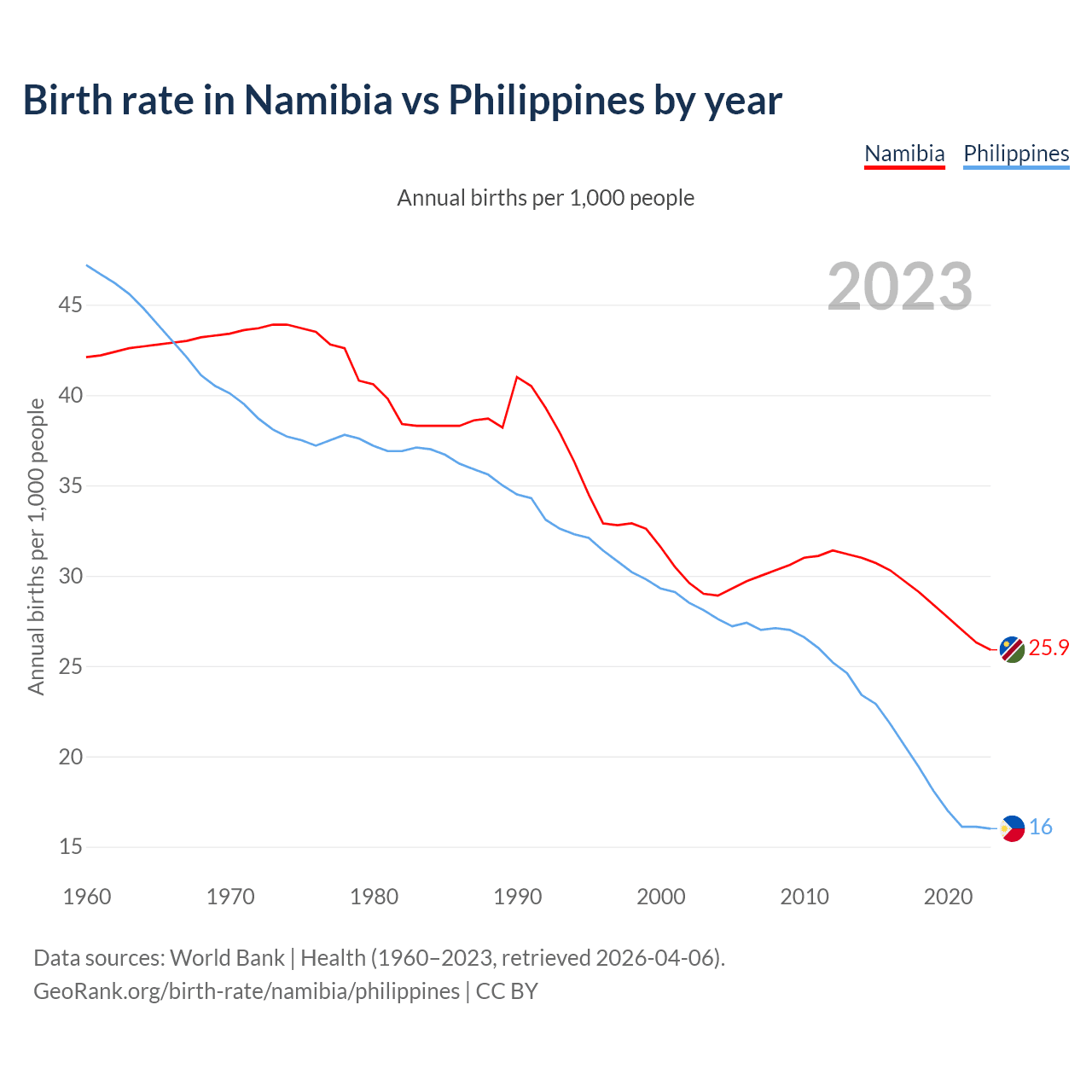 Namibia has an annual birth rate of 25.9 births per 1,000 people, compared to 16 for the Philippines. The average number of children a woman is expected to have during her lifetime — the fertility rate, is 3.21 in Namibia and 1.92 in the Philippines — 40.3% difference.