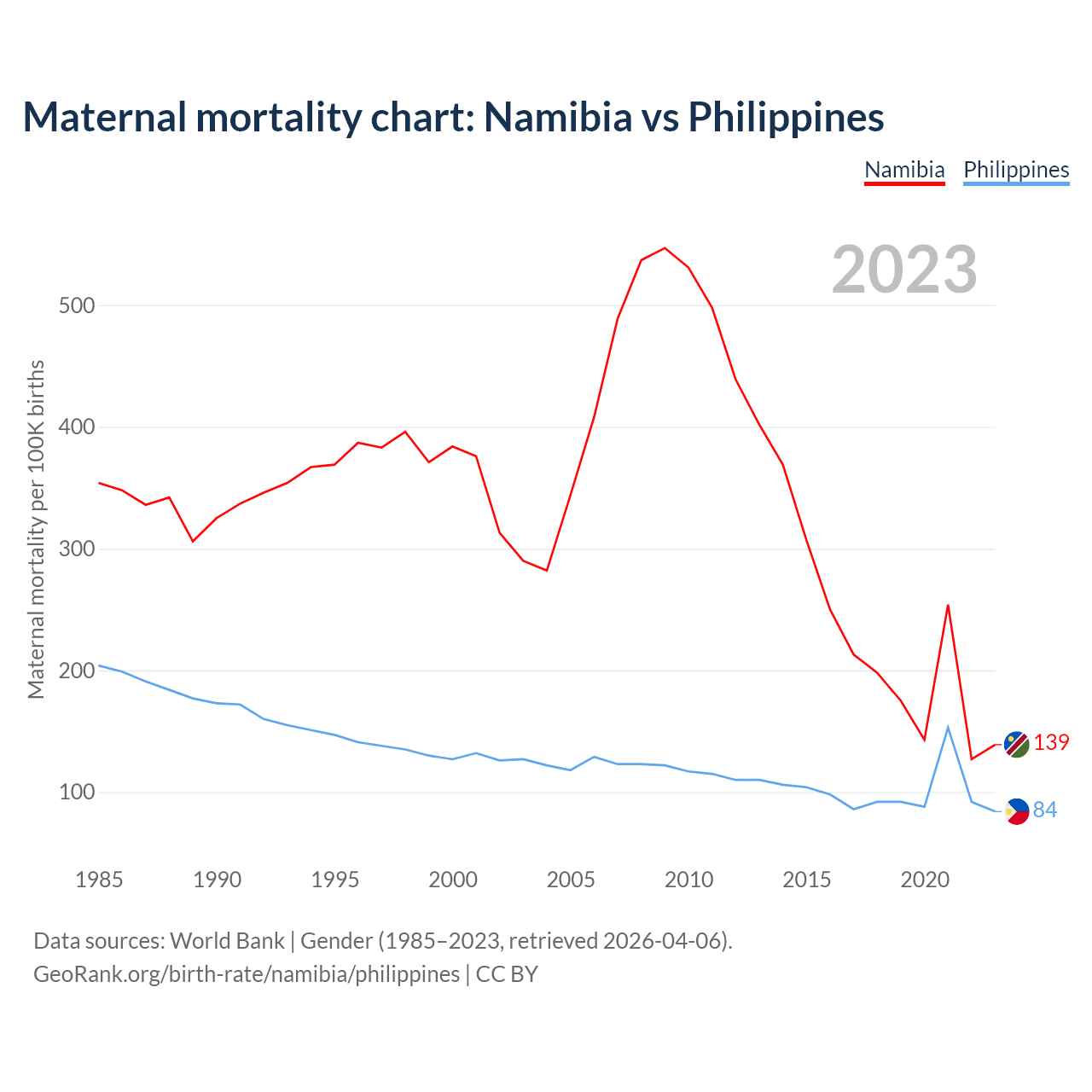 The maternal mortality rate, which is the probability of dying during childbirth or within 42 days of pregnancy termination, is 139 deaths per 100,000 live births in Namibia, compared to 84 deaths in the Philippines.