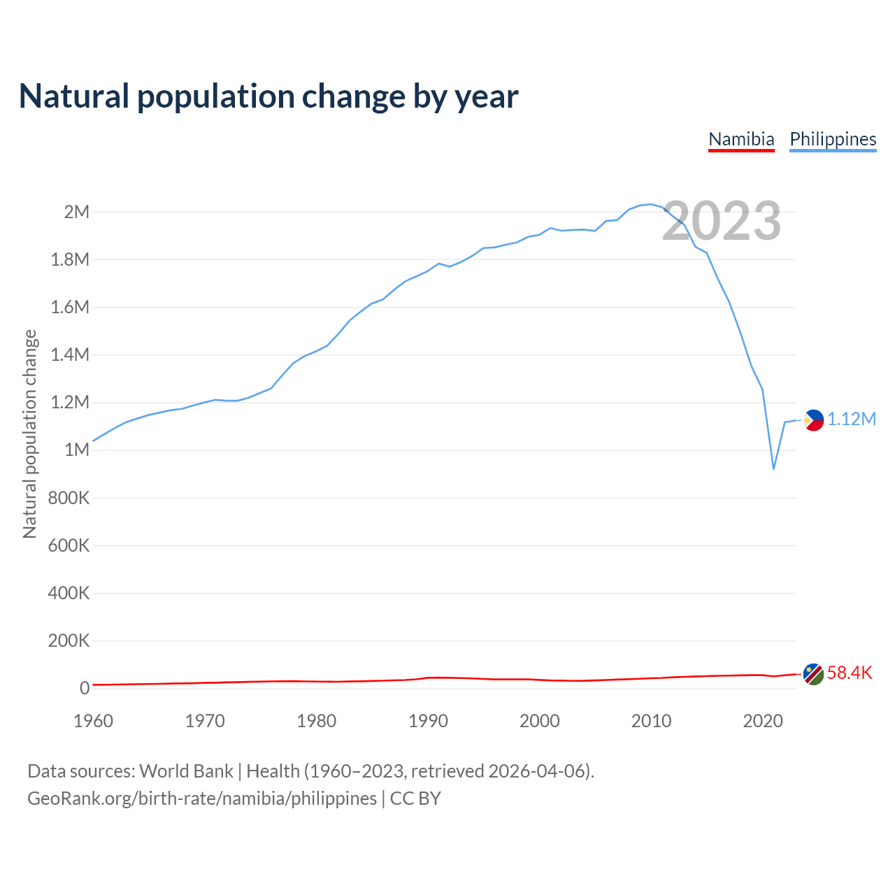 According to the latest available data on birth rates, the fertility rate in Namibia was 3.21 children per woman in 2023, compared to 1.92 in the Philippines in 2023. The replacement level is considered to be 2.1 children per woman.