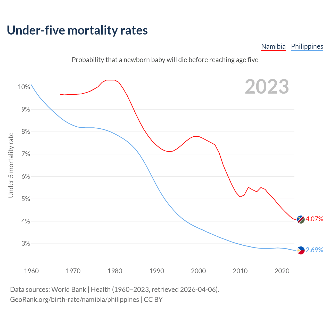 The chance that a newborn baby will die before reaching age five is 4.07% in Namibia and 2.69% in the Philippines. Above is a chart with historical data on under-five mortality rates.