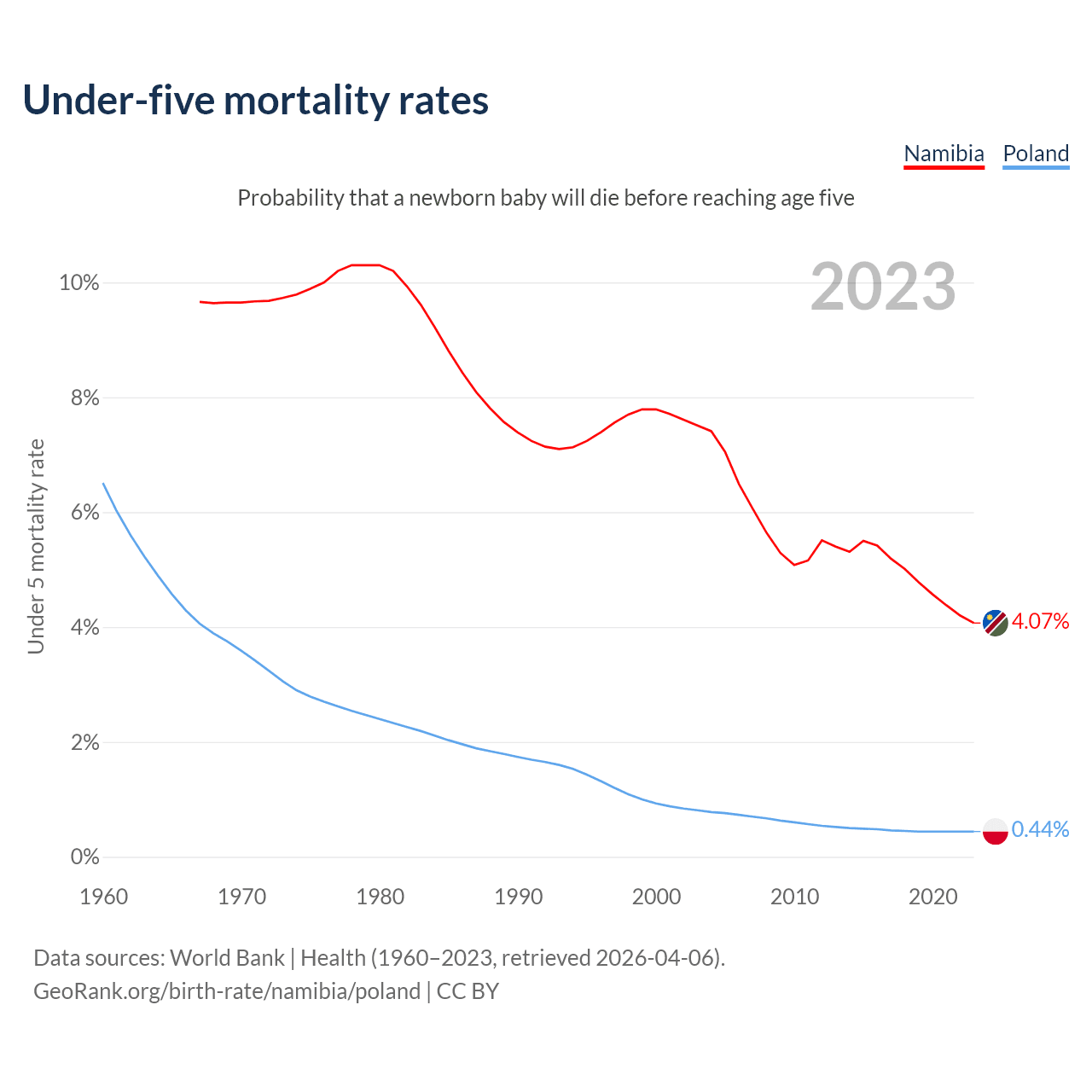 The chance that a newborn baby will die before reaching age five is 4.07% in Namibia and 0.44% in Poland. Above is a chart with historical data on under-five mortality rates.