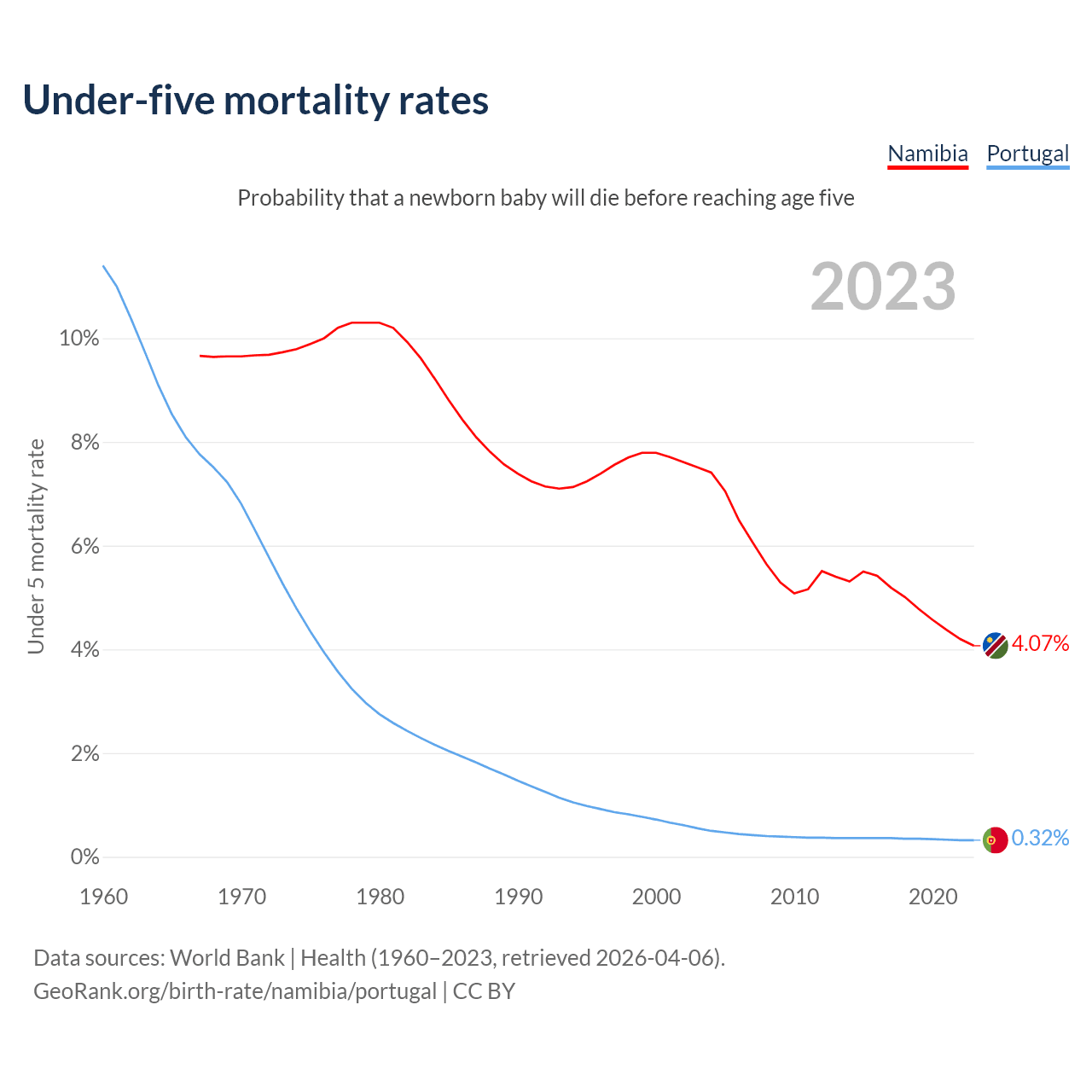 The chance that a newborn baby will die before reaching age five is 4.07% in Namibia and 0.32% in Portugal. Above is a chart with historical data on under-five mortality rates.