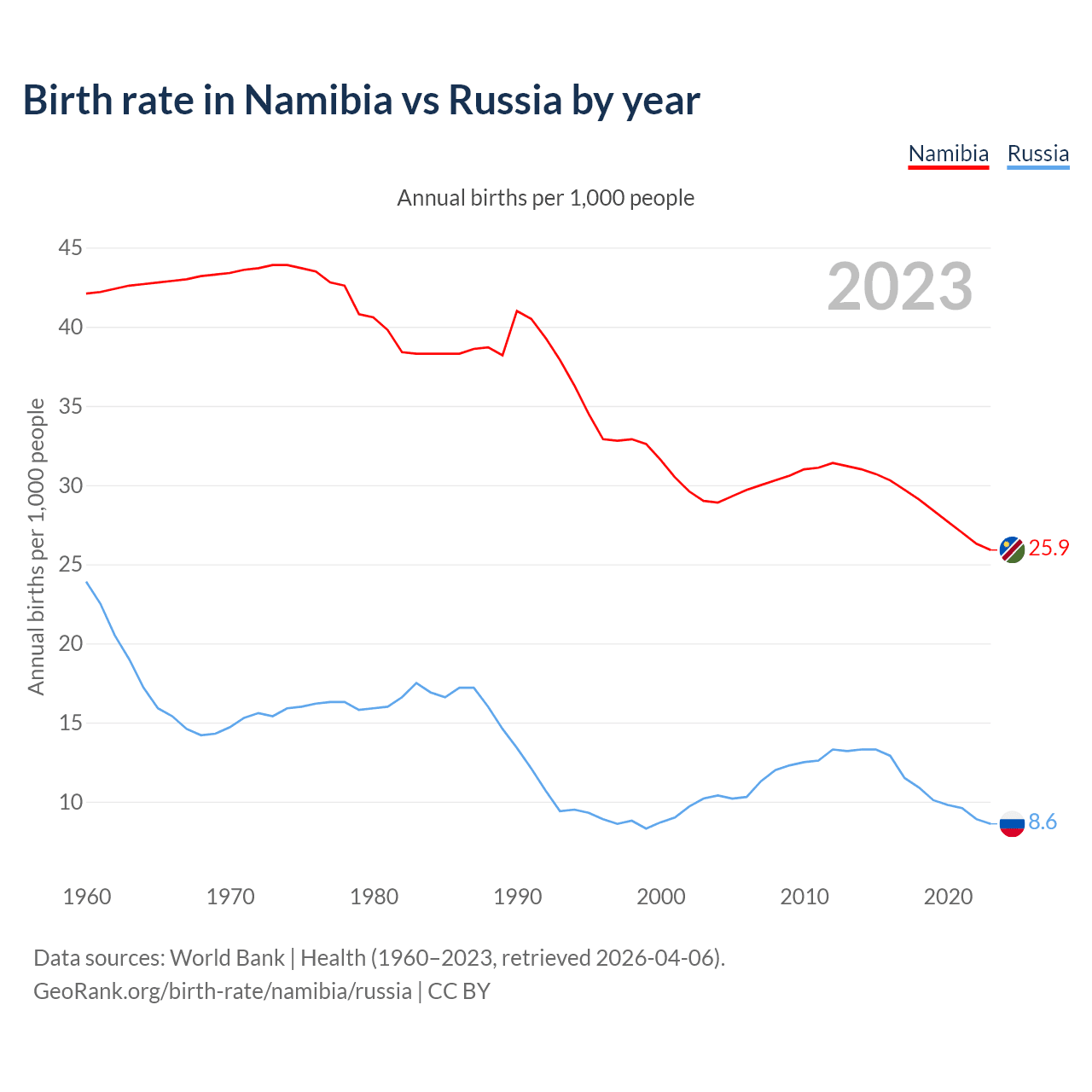 Namibia has an annual birth rate of 25.9 births per 1,000 people, compared to 8.6 for Russia. The average number of children a woman is expected to have during her lifetime — the fertility rate, is 3.21 in Namibia and 1.41 in Russia — 56.1% difference.