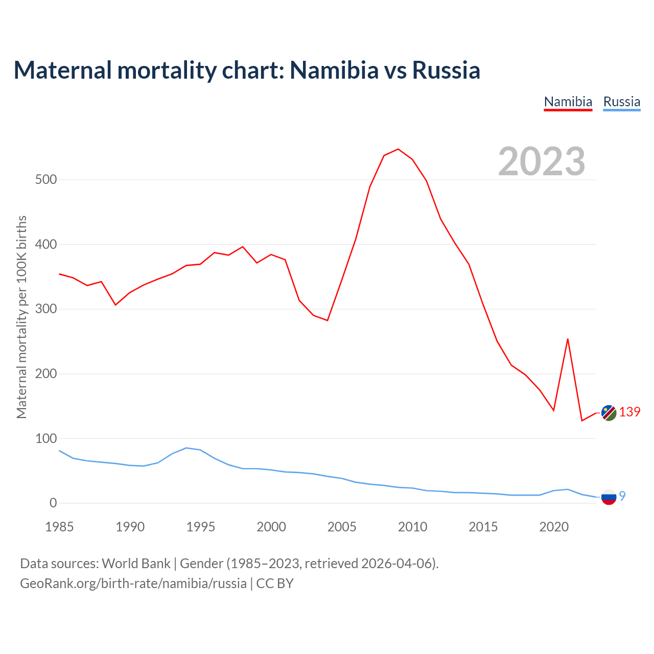 The maternal mortality rate, which is the probability of dying during childbirth or within 42 days of pregnancy termination, is 139 deaths per 100,000 live births in Namibia, compared to 9 deaths in Russia.