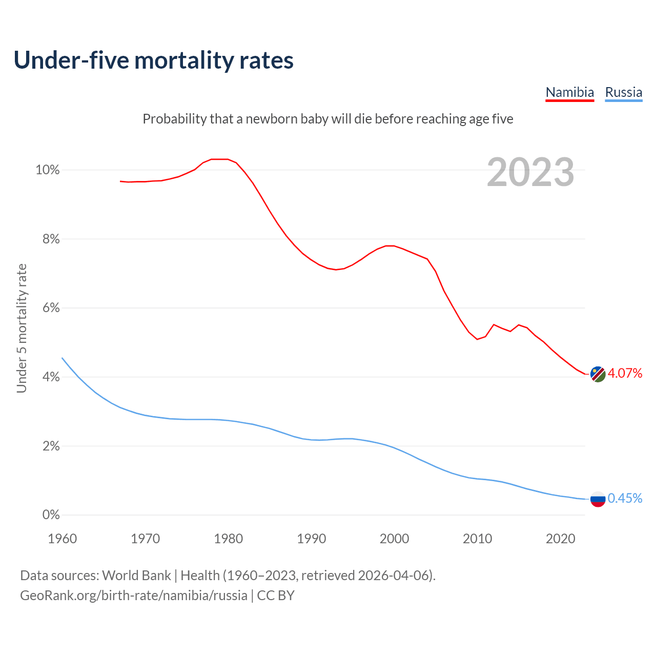The chance that a newborn baby will die before reaching age five is 4.07% in Namibia and 0.45% in Russia. Above is a chart with historical data on under-five mortality rates.