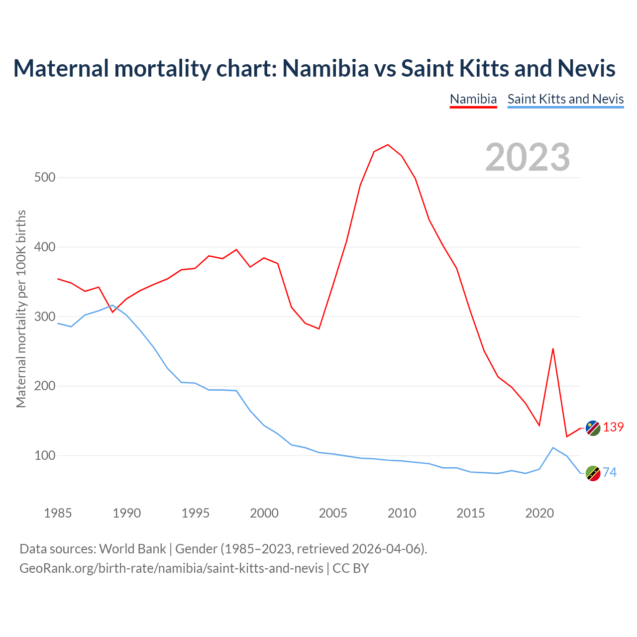 The maternal mortality rate, which is the probability of dying during childbirth or within 42 days of pregnancy termination, is 139 deaths per 100,000 live births in Namibia, compared to 74 deaths in Saint Kitts and Nevis.