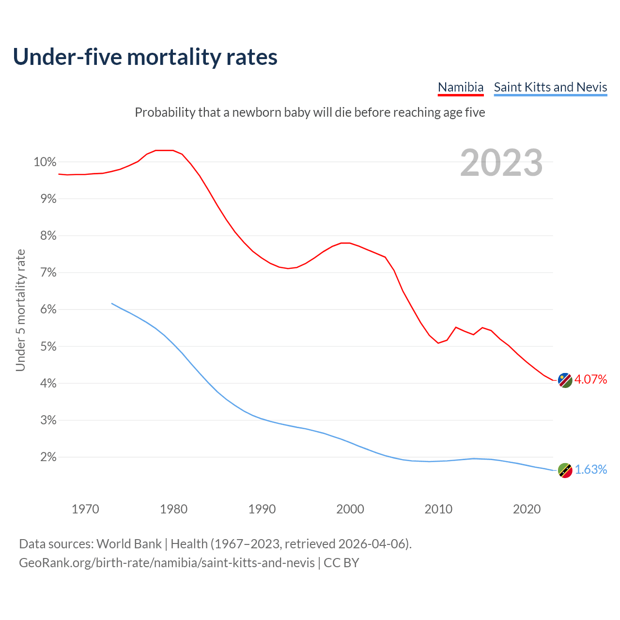 The chance that a newborn baby will die before reaching age five is 4.07% in Namibia and 1.63% in Saint Kitts and Nevis. Above is a chart with historical data on under-five mortality rates.