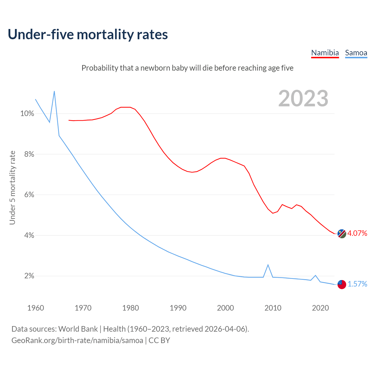 The chance that a newborn baby will die before reaching age five is 4.07% in Namibia and 1.57% in Samoa. Above is a chart with historical data on under-five mortality rates.